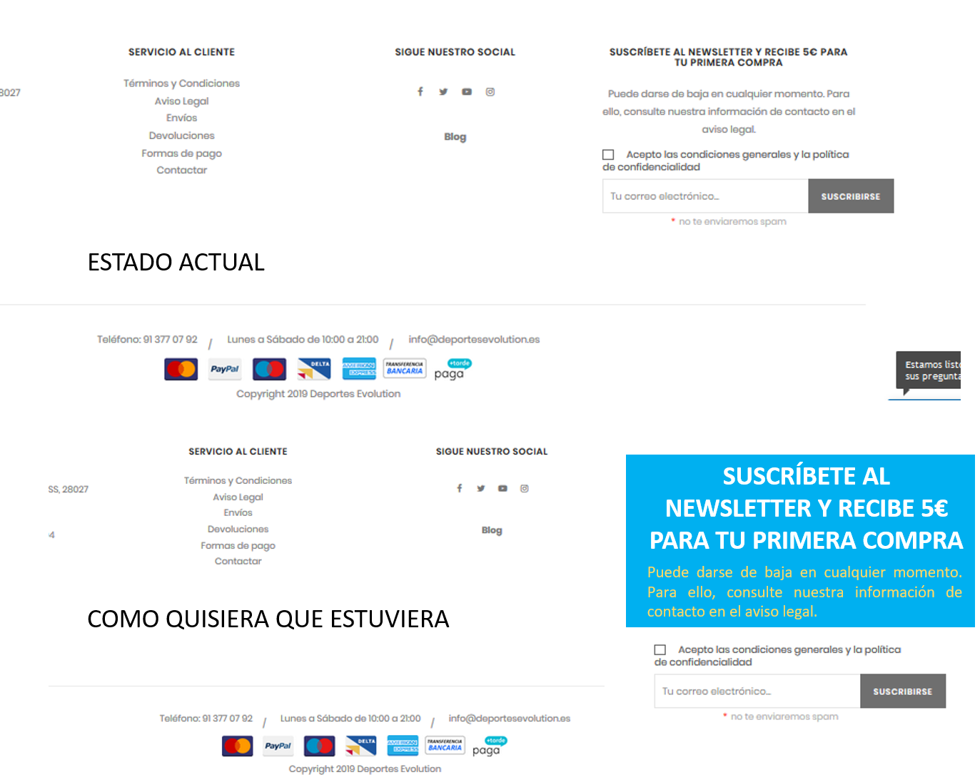 Gerardlay Posted February 13, 2020 Share Posted February 13, 2020 HOLA CHIC@S COMO OS COMENTÉ SON VARIOS DETALLES QUE QUIERO IR PULIENDO DE LA TIENDA Y ESTE ES OTRO. NECESITO RESALTAR LA SUSCRIPCIÓN A MI NEWSLETTER PERO EL DISEÑO QUE TIENE ES BASTANTE BÁSICO Y PASA POR DESAPERCIBIDO ANTE EL CLIENTE. ENVÍO EL PANTALLAZO DE CÓMO ESTÁ CÓMO QUISIERA QUE ESTUVIERA. ESTO NUNCA LO HE MODIFICADO Y LOS TUTORIALES QUE VEO SON DE VERSIONES ANTERIORES. PRESTASHO 1.7 PLANTILLA OREO Link to comment Share on other sites More sharing options...