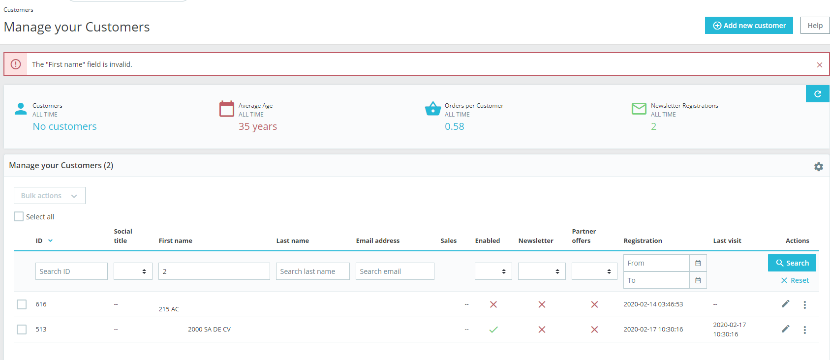 Ahora cuando los quiero habilitar me marca el error " The "First name" field is invalid. " y esto unicamente es en el back office, de igual forma cuando intento modificar sus datos me marca un error  500 "500 Internal Server Error".