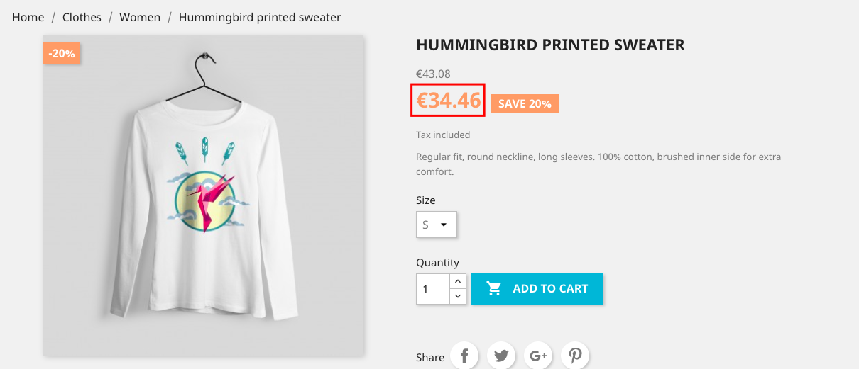 ricardopxl Posted February 21, 2020 Share Posted February 21, 2020 @Aldeag tal cual te indican debe hacerse por CSS. Es esto lo que quieres modificar? https://innocent-cup.demo.prestashop.com/en/women/2-9-brown-bear-printed-sweater.html#/size-s Si así es, en public_html/themes/classic/asset/css/custom.css agrega lo siguiente y quedará como la imagen que está más arriba: .current-price > span { font-size: 30px; } Link to comment Share on other sites More sharing options...