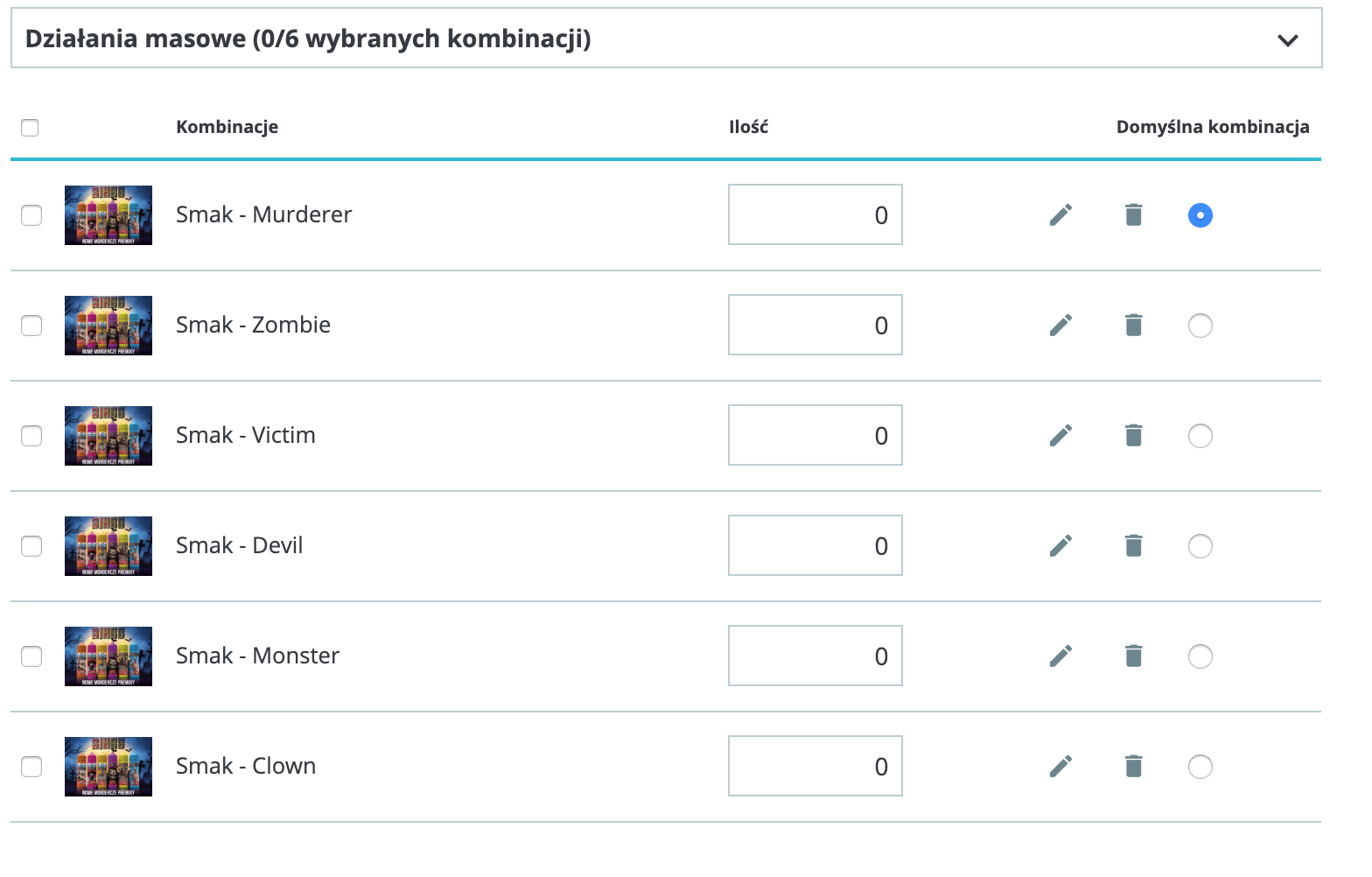 Chciałem utworzyć produkt z kombinacjami per smak. Utworzyłem nową pozycję w magazynie i do niej podłączyłem 6 kombinacji produktów. Mam jednak problem z ilością towaru w kombinacji. Chciałbym, żeby ilość danego smaku pobierała się z danej pozycji w magazynie. W konfiguracji kombinacji produktu do każdego smaku dopisałem Indeks z magazynu presty. Niestety stan nie jest pobierany z magazynu tylko na sztywno trzeba wpisać ilość w kombinacji, żeby wyświetliła się ona na karcie produktu.