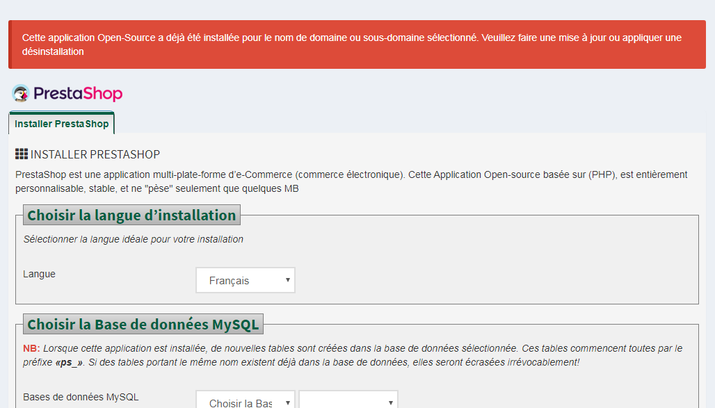 J'ai installé prestashop pour mon domaine et après avoir acheté le thème, j'avais de la peine à l'installer car je rencontrais toujours une erreur 500; dans mes nombreuses tentatives de recherche de solution à mon problème, j'ai dû par inadvertance désinstallé et il m'est possible de réinstaller actuellement parce qu'on me signale que prestashop est déjà installé pour mon domaine;
