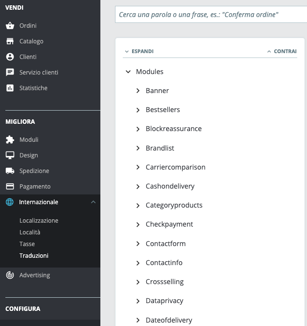 ho creato un modulo per PrestaShop 1.7.x basandomi su un modulo standard per iniziare a capire le meccaniche dei moduli. Sono riuscito a finirlo e ad installarlo. Vorrei ora, attraverso Internazionale>Traduzioni, inserire la traduzione in italiano delle parti in inglese. Il problema, come da titolo, è che non mi compare il modulo creato nella lista moduli. Essendo nuovo in questo mondo vorrei capire se bisogna inserire un file specifico, che abiliti la possibilità di tradurre, all'interno del modulo.