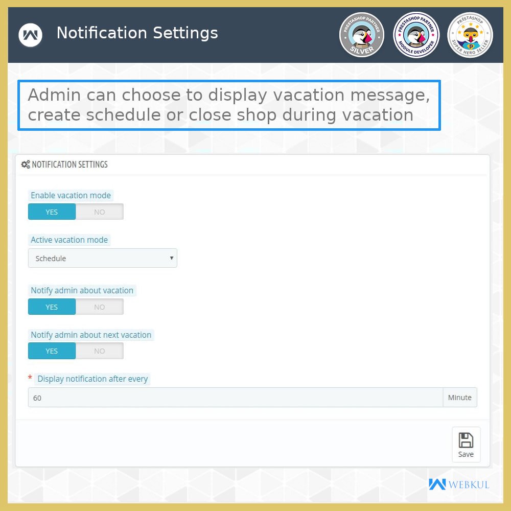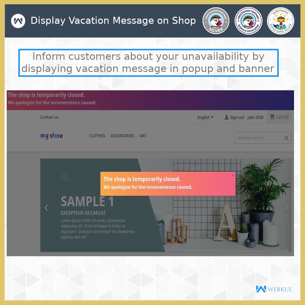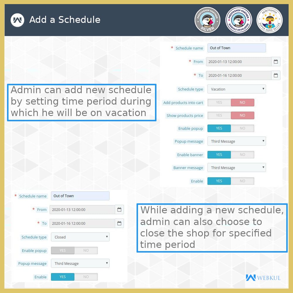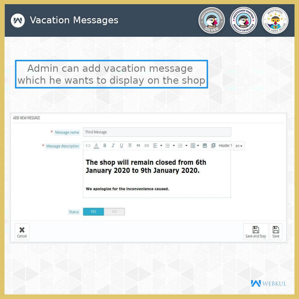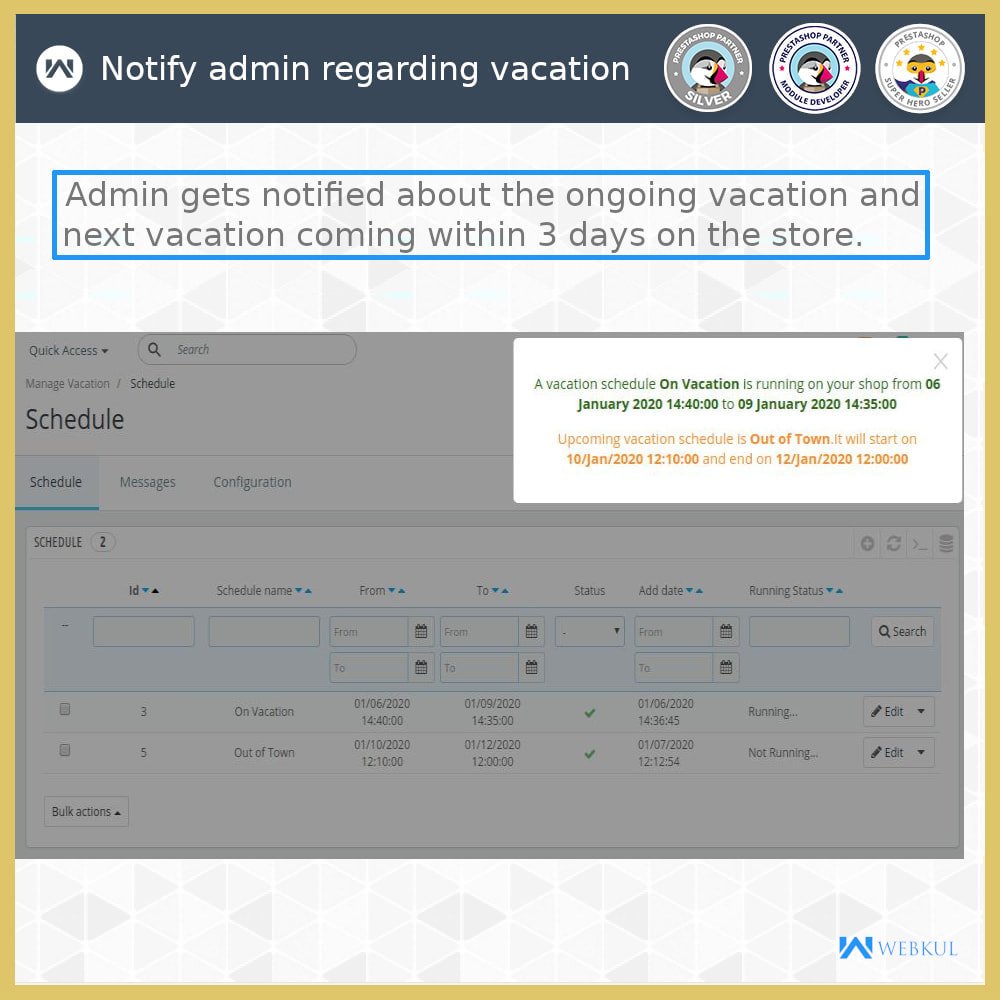 Webkul Modules Posted February 27, 2020 Share Posted February 27, 2020 (edited) Admin Vacation Module Prestashop Admin Vacation allows you to inform your customers about your unavailability when you are out of town or on a vacation. Simply create a vacation schedule by setting the time period and display a customized message on the store notifying customers of your absence. You can also choose to close your shop till the time you are on vacation so that you don’t have to worry about processing the orders upon return. Live Demo- https://addons.prestashop.com/demo/FO37791.html Module link- https://addons.prestashop.com/en/emails-notifications/47837-admin-vacation.html#overview Module features- Three Vacation modes: Message, Schedule, and Shop Close. Set the customized vacation message to be displayed in a popup and banner. Two vacation messages added in the module by default. Enable/Disable the display of vacation message in a popup/banner. Multiple options to customize the popup and banner in which vacation message is displayed. Create a schedule by setting the time duration for vacation. While creating a schedule, admin can also enable/disable the add to cart button and display of price on product page. Admin can also choose to close the shop for the time period set by him while creating a schedule. Admin can also set the time after which he will be notified regarding the ongoing vacation on the shop. Get notified of the next upcoming vacation within 3 days. Purchase link-https://addons.prestashop.com/en/emails-notifications/47837-admin-vacation.html#overview Amit Kushwaha/ Webkul Edited February 27, 2020 by Amit Kushwaha (see edit history) Link to comment Share on other sites More sharing options...