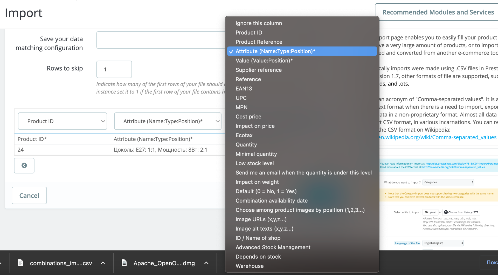 szczur3k Posted February 27, 2020 Share Posted February 27, 2020 (edited) OK, it works. I selected the wrong column type in the import settings. Hi. I have a lot of data in my database and I would like using a CSV file to import to Presta a list of features and products with assigned features. But how, if at all possible? In the CSV file I created a features column, format: name1:value1:0,name2,value2:1 etc. When importing I choose the correct type in my column and everything: description, name, images etc. is imported, but not features. Sorry for my scary English BTW Edited February 27, 2020 by szczur3k (see edit history) Link to comment Share on other sites More sharing options...