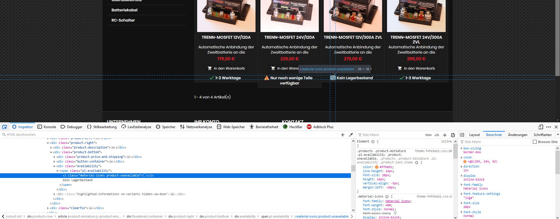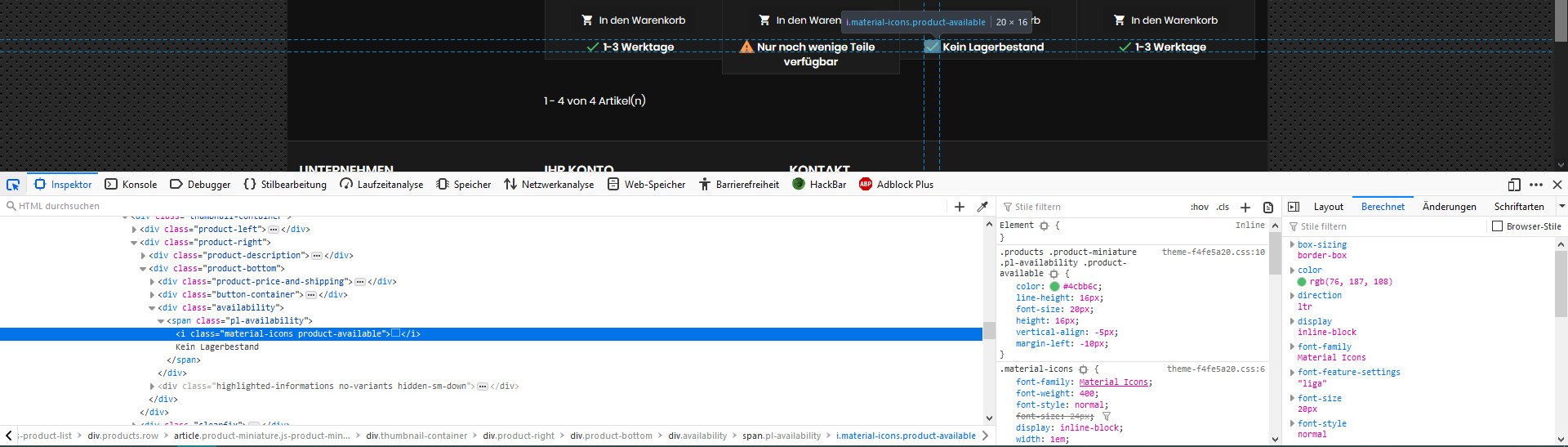 Gummiwutzel Posted March 4, 2020 Share Posted March 4, 2020 Hallo zusammen! Mein kleiner Elektronikshop mit Prestashop 1.7.6.3 leidet an einem eklatanten Mangel aktivierbarer Symbole, welche die Lieferfähigkeit bzw. die Lieferzeit sinngemäß zutreffend symbolisieren. So habe ich immer wieder mal Artikel, die eine deutlich längere Lieferzeit aufweisen, wenn der Lagerbestand erst mal auf Null abgesunken ist. Während ab Lager lieferbare Artikel korrekt durch das grüne Häkchen und Artikel mit geringem Lagerbestand korrekt mit dem gelben Dreieck markiert werden, erscheint bei ausverkauften Artikeln widersinnigerweise wieder das grüne Häkchen. Der zusätzliche Hinweis "Kein Lagerbestand" ist so natürlich vom Kunden kaum zu verstehen, wenn er ihn denn überhaupt wahrnimmt. Wie kriege ich es jetzt hin, dass ein passendes - optimalerweise rotes - Symbol angezeigt wird, wenn der Lagerbestand auf Null gesunken ist? Entsprechende Symbole gibt es ja im Shop. Wo muss die Code-Pinzette sinnvoll zugreifen? Grüße, Tom Link to comment Share on other sites More sharing options...