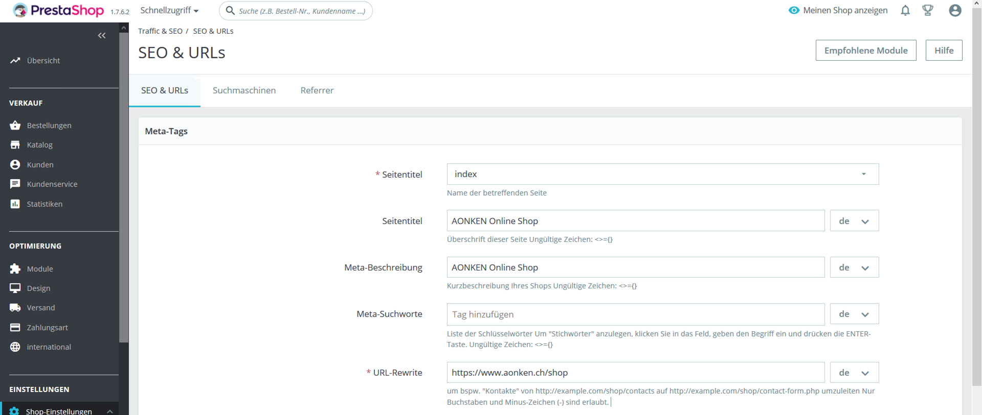 Aonken Posted March 4, 2020 Share Posted March 4, 2020 Hallo Ich versuche die SEO Einstellungen zu speichern. Leider nach "Speichern" bekomme ich folgeden Fehler Meldung: Ein unerwarteter Fehler ist aufgetreten. [PrestaShop\PrestaShop\Core\Domain\Meta\Exception\CannotEditMetaException Code 0] und die Einstellungen werden nicht gespeichert. Ich habe folgende Optionen gewählt: "Traffic & SEO" ->"Startseite konfigurieren" -> "Meta Tags" Wie kann die Meta Tags Änderungen anpassen ohne Fehlermeldung? Danke schon im Voraus für die Antwort🌹 Link to comment Share on other sites More sharing options...