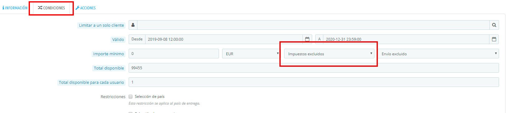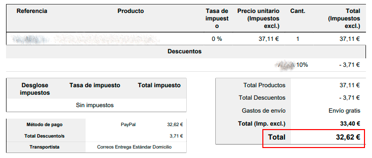 iMillenium Posted March 6, 2020 Share Posted March 6, 2020 Hola a todos; Tenemos configurada nuestra tienda para que los pedidos con destino Canarias, Ceuta, Melilla y Andorra no aplique IVA, incluso que los precios los muestre sin IVA. Hasta aquí no tenemos problema ninguno. El problema nos surge cuando un cliente desde Canarias, Ceuta, Melilla o Andorra aplica un vale descuento. Resulta que durante el proceso de compra, al descuento sí le aplica su correspondiente IVA y entendemos que ésto no debe ser así. El IVA en el descuento lo aplica en el total de carrito y total factura (IVA incluido) tal y como podéis ver en la imagen que adjunto. En este caso concreto, entiendo que el total que aparece en el recuadro rojo debe ser también de 33,40€. Ésto ocurre en todo el proceso de compra, página de pedido del backoffice y factura. Adjunto captura de nuestra configuración de IVA y de una factura. Versión de PrestaShop: 1.7.3.2 Versión PHP: 5.6.40 Link to comment Share on other sites More sharing options...
