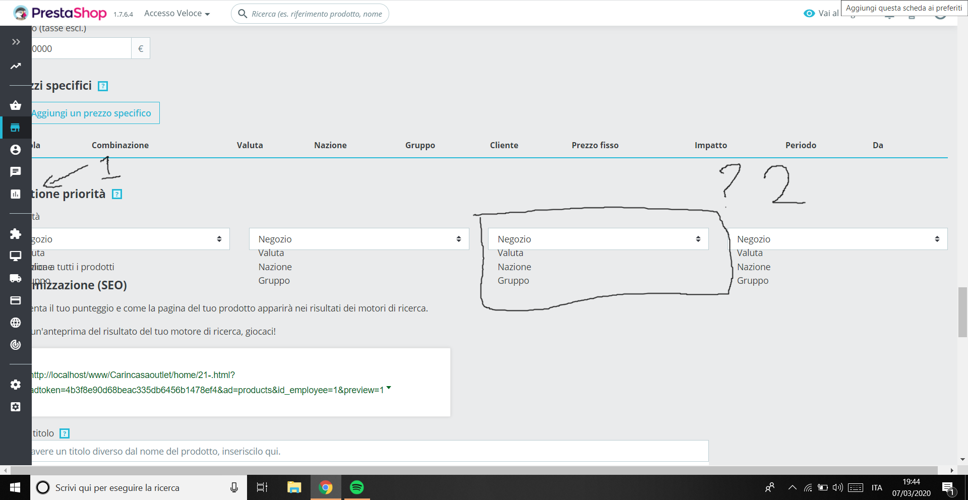 Andrea.24 Posted March 7, 2020 Share Posted March 7, 2020 (edited) Salve a tutti, è la prima volta che uso Prestashop ma ho dei problemi nel back-office del sito (per ora ho fatto il server sul locale e installato Prestashop). Ho principalmente due problemi: 1) Quando creo un nuovo prodotto, scendendo per inserire le altre informazioni del prodotto, la pagina viene "tagliata" al bordo sinistro e quindi non riesco a leggere/inserire le info giuste. 2) I menu a tendina in tutto il back-office (quelli con doppia freccia alto/basso) dove ci sono varie opzioni non funzionano (cliccando non succede niente/non risponde). Allego una foto per far capire il problema. Qualcuno potrebbe aiutarmi nel trovare una soluzione? Versione: 1.7.6.4 Template: classic 1.0.0 (template iniziale) Grazie in anticipo. Edited March 7, 2020 by Andrea.24 (see edit history) Link to comment Share on other sites More sharing options...