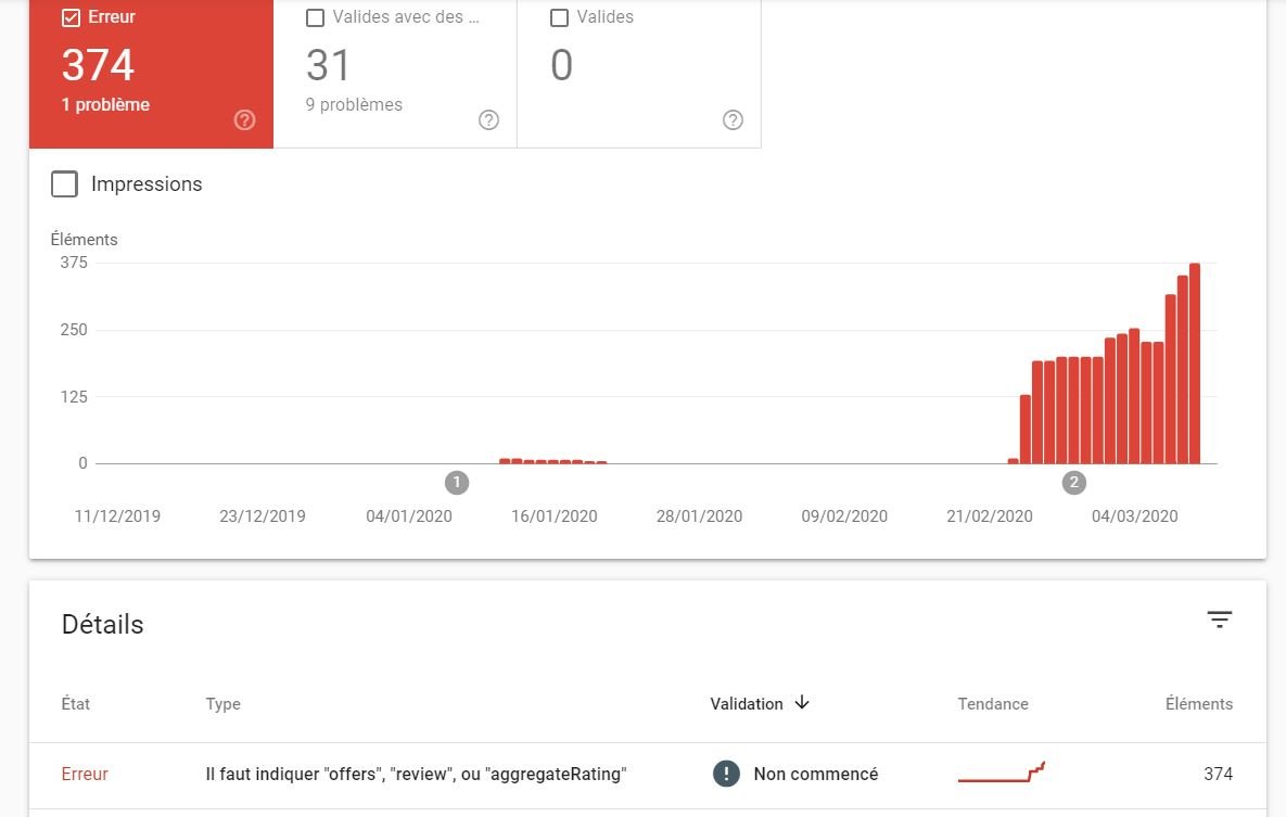 mims66 Posted March 10, 2020 Author Share Posted March 10, 2020 Il y a 2 heures, Manu-shop a dit : bonjour, c'est bien indiqué dans google. vous avez plusieurs erreurs par produit. Pour 1 produit, vous avec une erreur offre, avis produit, ... Car vous devez ne pas avoir d'avis sur vos produit. Donc cela créé des erreurs pour google. Si vous avez une page avec minimum un avis, test avec rich snippet avec le lien de votre page produit. Vous verrez si vous avez toujours des erreurs. Si oui, il faudra corriger votre thème. Bonnes ventes 😉 Bonjour merci pour votre reponse 🙂 Par contre savez vous pourquoi autant d erreur pour juste 60 produits ? es ce que cela a voir avec les categories ? Link to comment Share on other sites More sharing options...