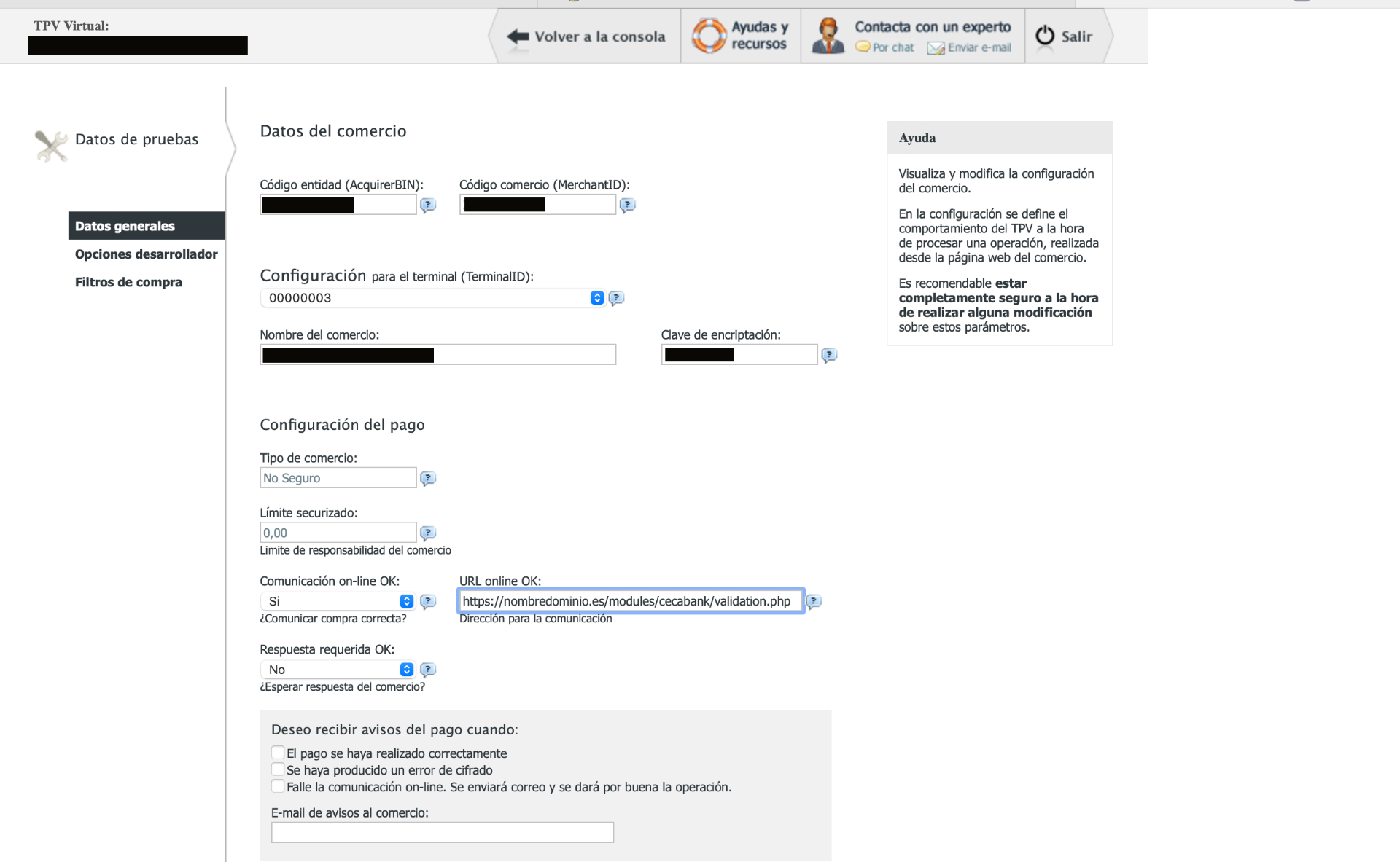 Cuando trabajamos con el módulo CECA debemos registrar la dirección de retorno en el panel de administración del TPV de la entidad.