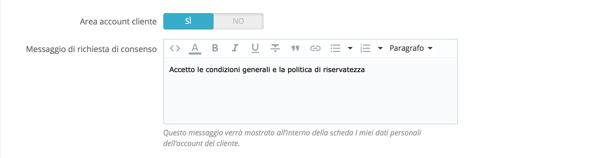 iDario Posted March 17, 2020 Share Posted March 17, 2020 Chiedo scusa, sono alle primissime armi. Ho attivato, tramite la scheda apposita sul Modulo Ufficiale Conformità GDPR v.1.1.3 (su PS 1.7.6.3), la spunta di un flag per accettazione del GDPR. Su questa scheda non ci sono altre opzioni oltre a poter attivare/disattivare ed il testo che deve comparire. A questo punto, nell'Area personale, nei miei dati, compare questo flag con scritto "Accetto le condizioni generali e la politica di riservatezza" Lo spunto, mi obbliga ad inserire la password, salvo ma... niente! Il flag torna pulito. Sbaglio qualcosa io? Grazie Link to comment Share on other sites More sharing options...