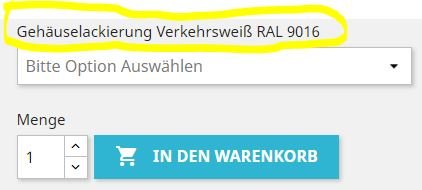 Tiroler Posted March 20, 2020 Author Share Posted March 20, 2020 Just now, JBW said: Ja genau, da siehst du ja das die Variante korrekt wie im Shop ist - "abgesetzte DC77-Antenne" Die Variante passt jetzt, aber wie bekomme ich den Text über dem Drop-Down Feld umgeändert? Da wo jetzt "Gehäuselackierung Verkehrsweiß RAL 9016" steht? Link to comment Share on other sites More sharing options...