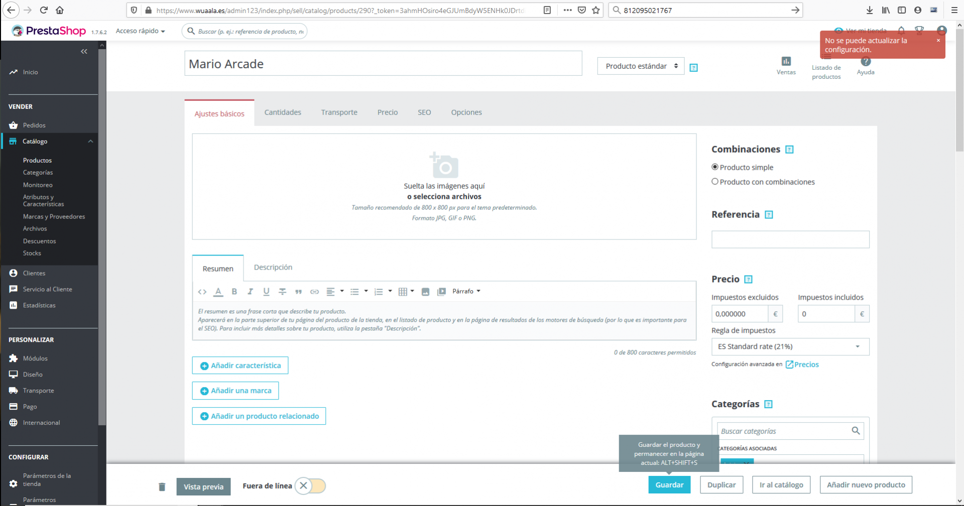 Wuaala Posted March 23, 2020 Author Share Posted March 23, 2020 El error sale en un bocadillo, igual que cuando no asignas categoría principal, la versión de Prestashop es la 1.7.6.2 con el tema classci version 1.0.0 Link to comment Share on other sites More sharing options...