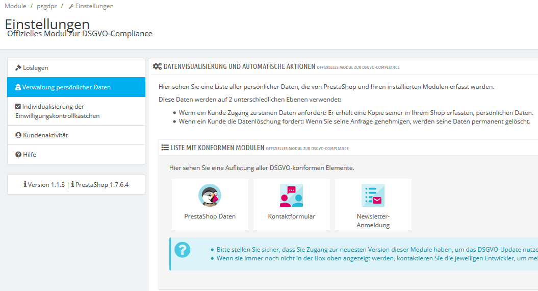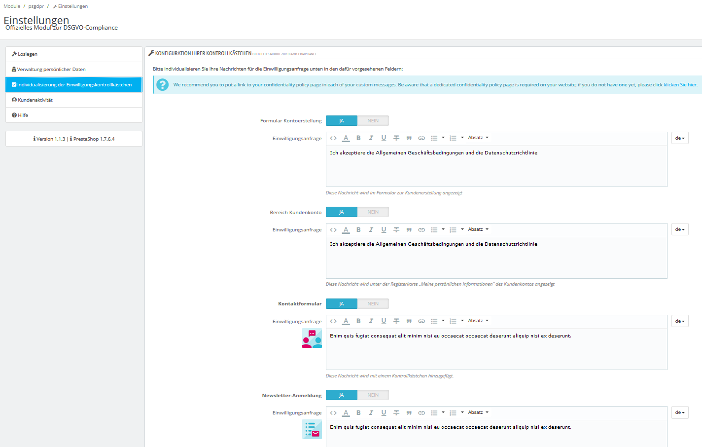 SliderFlash Posted March 25, 2020 Share Posted March 25, 2020 (edited) vor 18 Stunden schrieb bfree: so wie in deinen bildern dargestellt hätte ich es auch gerne. Hast du auch das richtige Modul Gdpr installiert ? und DSGVO für 1.6 und für 1.7 Zitat warum man bei der onboard newsletteranmeldung von ps 1.7.1.1 - 1.7.6.4 nicht den einwilligungstext aus dem onboard dsgvo module angezeigt bekommt Das ist Nicht DSGVO Modul das ist Gdpr Modul, hier oben ist Gdpr Link Edited March 25, 2020 by SliderFlash (see edit history) Link to comment Share on other sites More sharing options...