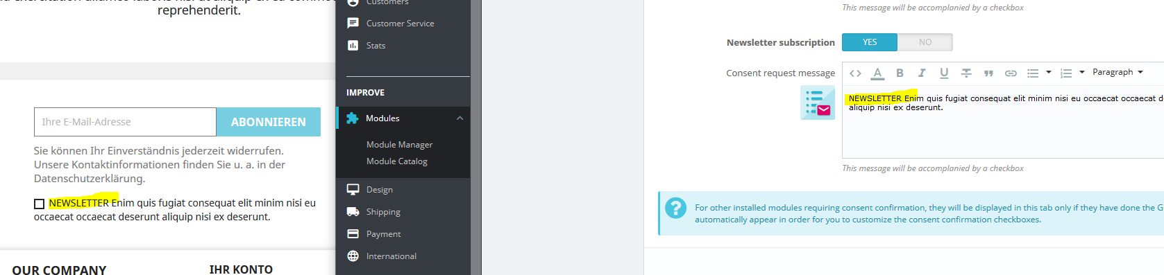 bfree Posted March 24, 2020 Author Share Posted March 24, 2020 hallo jbw, vielen dank für deine antwort bzw. information. ja ... so wie in deinen bildern dargestellt hätte ich es auch gerne. im datenschutz modul ist auch alles ident wie bei dir ... nur frontseitig im newsletterbereich sehe ich nur die checkbox bzw. einwilligungstext vom "newsletter - anmeldungs" modul ... (so wie es vor der dsgvo immer war) auch wenn ich dort in der modulkonfiguration nichts hinterlege ... dann steht frontseitug auch nichts. das datenschutzmodul überschreibt einfach das newsletter anmelde modul nicht ... umgekehrt sehe ich im protokoll des dsgvo moduls auch nicht das jemand seine einwilligung gegeben hätte ;-( da ich dies auch durch mehrere prestashop versionen versucht habe ... von 1.7.1.1 bis 1.7.6.4 ... gibt es da noch irgendwo eine konfigurationsmöglichkeit das module miteinander dürfen? 😉 vielen dank beste grüsse gee Link to comment Share on other sites More sharing options...