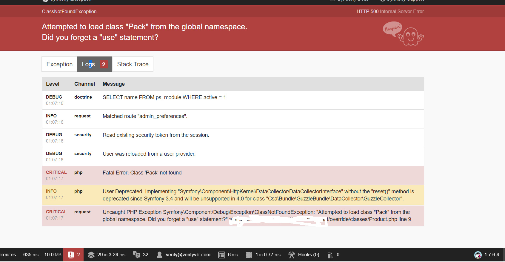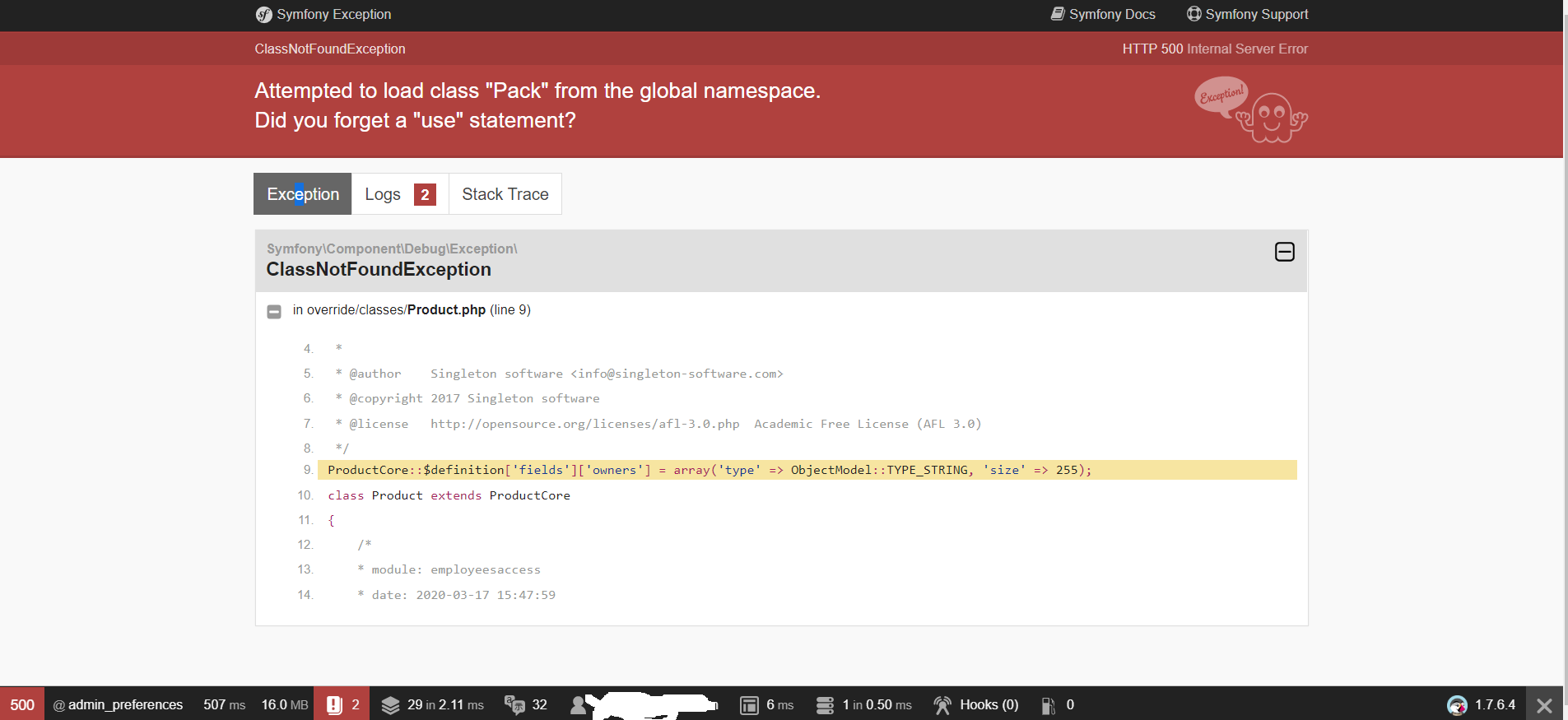 The server returned a "500 Internal Server Error"... in v 1.7.6.4...