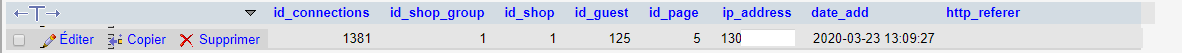 matlatourte@hotmail. Posted March 23, 2020 Author Share Posted March 23, 2020 ok j'avais vu cela mais par exemple je me connecte et voici ce qui arrive dans ps_connections (ci joint) je n'ai que l'ip et id_guest ne correspond pas au id_customer comment les relier ? car en effet id_guest de la section ps_connection est bien fixe lorsque c'est un customer qui se connecte... merci d'avance ! Link to comment Share on other sites More sharing options...
