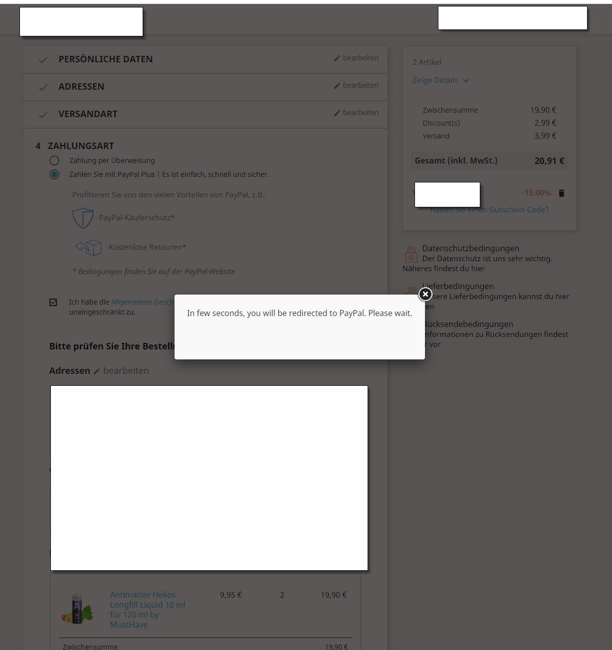 • Der Rabatt wird in der PayPal Zahlung nicht berücksichtigt. Bedeutet, ich habe 20,00 im Warenkorb, nutze 10% Rabatt (=18,00), gehe zur PayPal Bezahlung, steht dort wieder 20,00 €