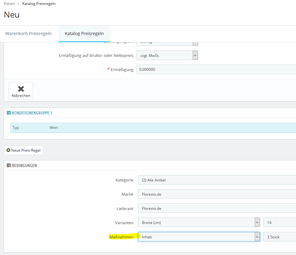 rictools Posted March 25, 2020 Share Posted March 25, 2020 "Massnahme" ist nur eine falsche Übersetzung von (ich glaube) "Eigenschaften". Was heißt Rabattierung? Eine generelle Preissenkung oder eine Katalogpreisregel (dabei kannst du ja unten eine Regel hinzufügen, nachdem die Regel nur für eine bestimmte Eigenschaft angewandt wird)? Link to comment Share on other sites More sharing options...