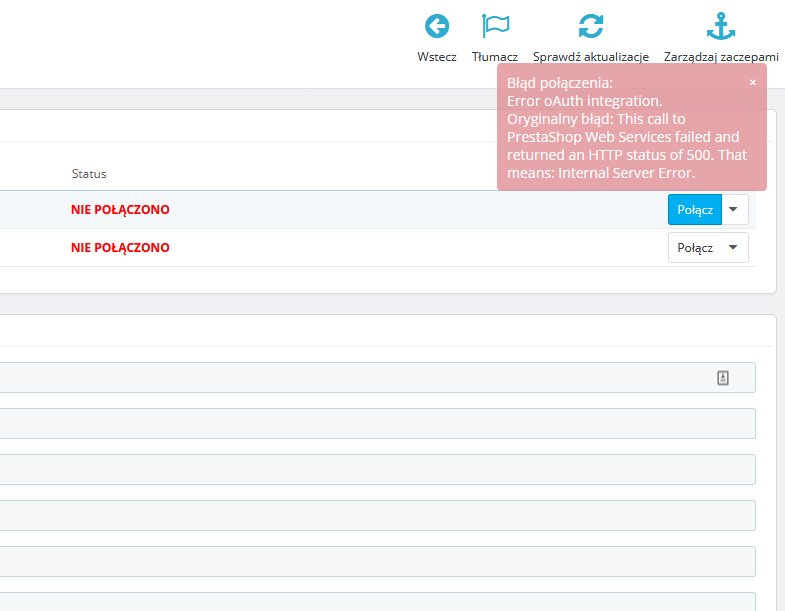 Przy probie połączenia, najpierw pojawiał się błąd: Http status 500
