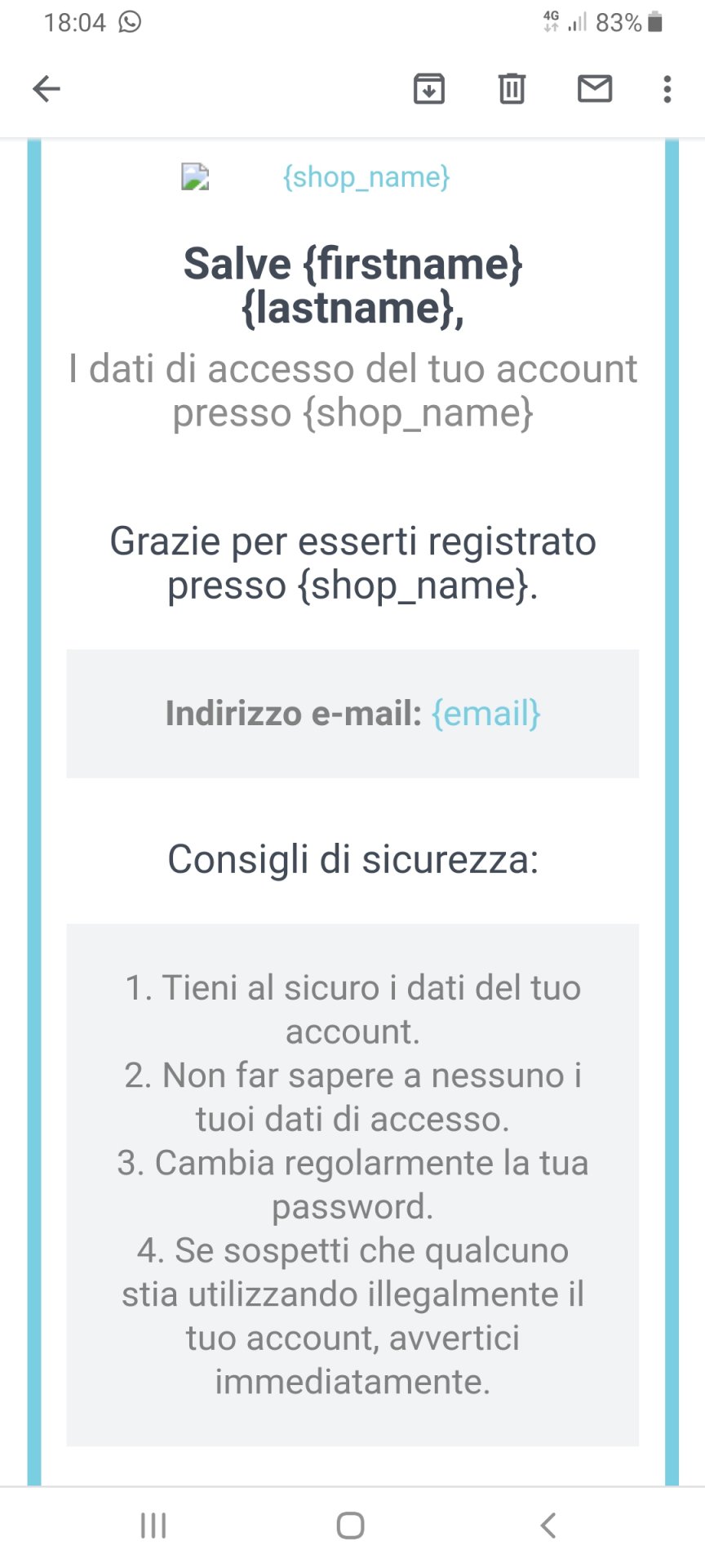 grazian Posted March 25, 2020 Share Posted March 25, 2020 (edited) Salve, utilizzo la versione 1.7.6.2. Il mio problema riguarda l'invio delle email automatiche. Sto facendo varie prove, e quando un probabile cliente si registra o fa un ordine l'email che riceve è questa. Ho provato di tutto ma proprio non riesco a capire come risolvere il problema. Anche online non ho trovato soluzioni. Qualcuno può darmi delle delucidazioni al riguardo? Come posso risolvere il problema? Anche nelle email di conferma d'ordine i dati NON vengono inseriti Edited March 26, 2020 by grazian (see edit history) Link to comment Share on other sites More sharing options...