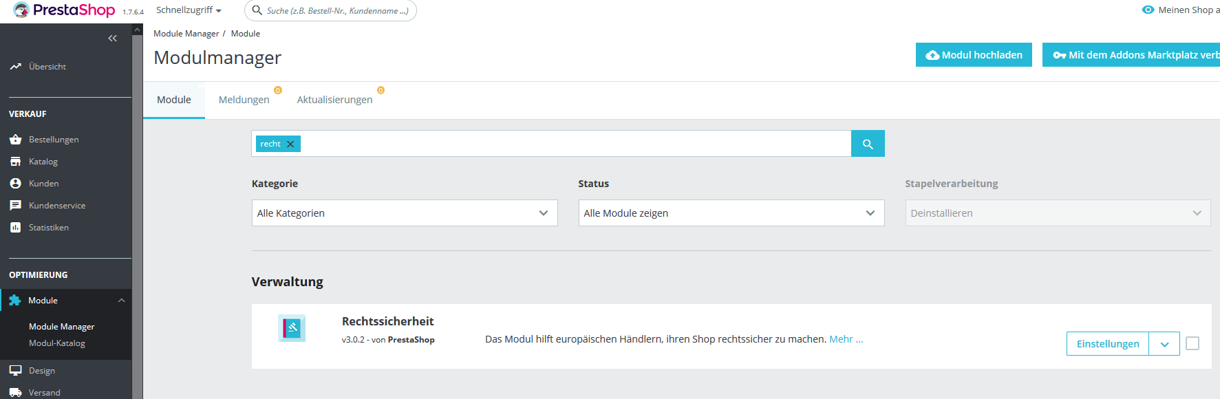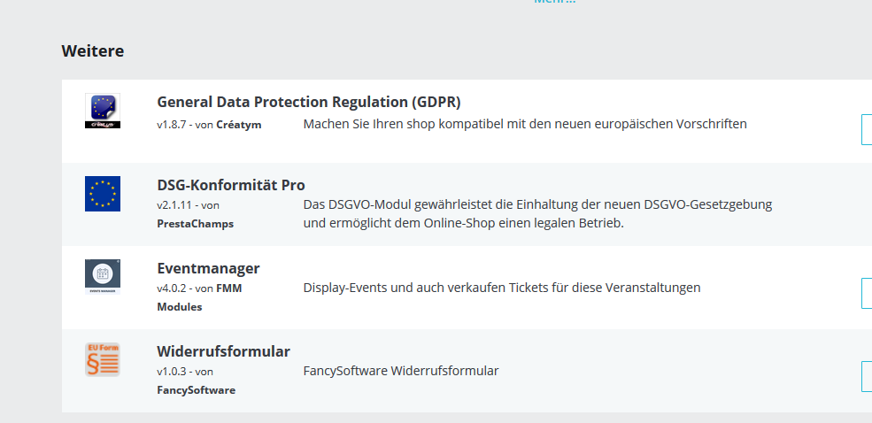 rictools Posted April 10, 2020 Share Posted April 10, 2020 Bei dir scheint einiges in englisch angezeigt zu werden, was normalerweise deutsch ist. Versuch's mal mit dem Suchbegriff "legal" (legalcompliance). Oder versuch's mit dem Download von https://github.com/PrestaShop/ps_legalcompliance/archive/master.zip Link to comment Share on other sites More sharing options...