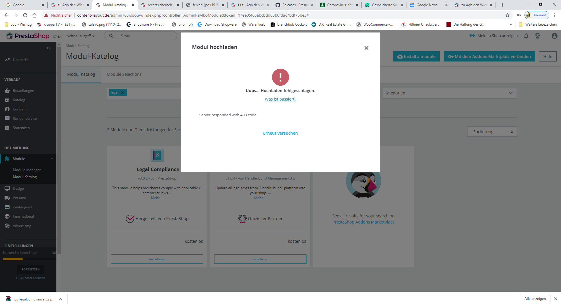 webmaus72 Posted April 10, 2020 Share Posted April 10, 2020 (edited) Guten Morgen, mit der Suche nach "legal" wird das Modul tatsächlich gefunden, vielen Dank für den Tipp ! Allerdings lässt es sich nicht installieren. Drück ich auf den Button "installieren", wird dieser kurz weiß und sieht dann gleich wieder so aus. Installiert wird nichts (bei irgendeinem anderen Modul ging es aber bereits). Will ich die Datei installieren (danke für den Link), bekomme ich auch eine Fehlermeldung (sämtliche Ordner haben schreibrechte, 755): Wie kann ich das OProblem beheben ? "Alternativ gibts hier dem Source Code: https://github.com/PrestaShop/ps_legalcompliance/releases" > Wo muss ich den Einfügen ? Danke PS: der doppelte Post war versehentlich ... Edited April 10, 2020 by webmaus72 (see edit history) Link to comment Share on other sites More sharing options...