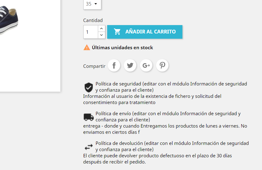 haf Posted April 2, 2020 Share Posted April 2, 2020 No hayo como quitar esta información en el frontoffoce de prestashio 1.7.6.4 ( ido a modulo de cumplimiento normativo legal , luego he ido mil y una vez a Diseño->Paginas lo he editado pero nada sigue saliendo en el frontoffice " Política de seguridad (editar con el módulo Información de seguridad y confianza para el cliente) Información al usuario de la existencia de fichero y solicitud del consentimiento para tratamiento Política de envío (editar con el módulo Información de seguridad y confianza para el cliente) entrega - donde y cuando Entregamos los productos de lunes a viernes. No enviamos en ciertos días f Política de devolución (editar con el módulo Información de seguridad y confianza para el cliente) El cliente puede devolver producto defectuoso en el plazo de 30 días después de recibir el pedido." Link to comment Share on other sites More sharing options...