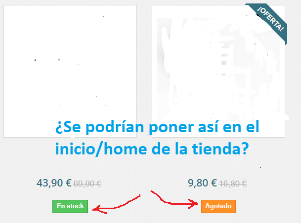 Mery30 Posted April 17, 2020 Author Share Posted April 17, 2020 Hola, aunque de momento no he conseguido sacar los que vienen por defecto, he conseguido hacer que aparezcan los bonitos. Mi ruta era: /public_html/themes/default-bootstrap/css Y el archivo es el: product_list.css Cambiar la linea que pone (en mi archivo es la 387): #index ul.product_list.tab-pane > li .availability { display: none; } por: #index ul.product_list.tab-pane > li .availability { display: show; } Es un apaño mio pero ha funcionado, jijijijiji (yo no sé nada de códigos por lo que no sé si hay una opción mejor). Mi versión de Prestashop es la 1.6.1.18 Si encuentro cómo sacar los feos, os aviso, por si a alguien le interesa. Link to comment Share on other sites More sharing options...