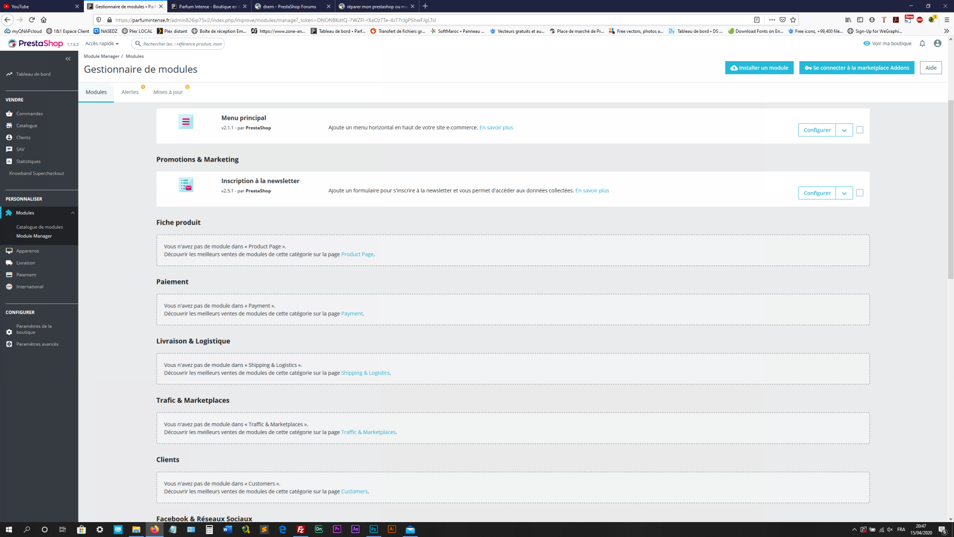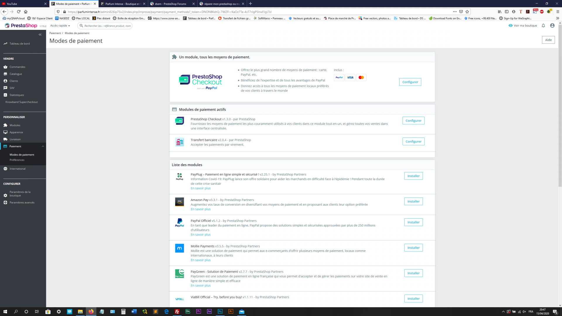dsem Posted April 15, 2020 Author Share Posted April 15, 2020 bonjour, jai deux probleme, 1- impossible de mettre à ajour prestashop 1.7.5.2 -> derniere version 2- module de paiement installé dans la back office mais n'apparait pas dans les modules de paiements actifs et n'apparait pas non plus sur mon site, j'ai un message comme ceci : Aucune méthode de paiement est disponible. donc je ne sais pas du tout comment réparer ce probleme de paiement Link to comment Share on other sites More sharing options...