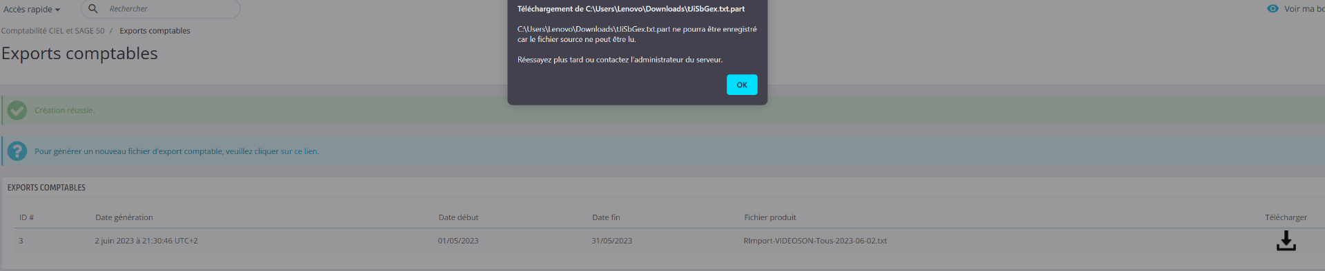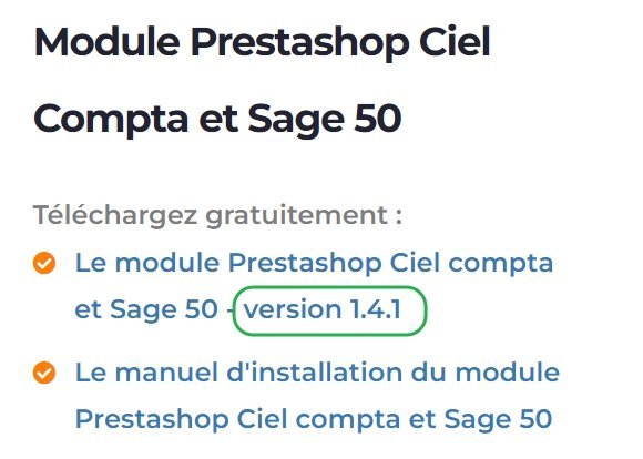 JohnsCamper Posted May 24, 2023 Share Posted May 24, 2023 (edited) Bonjour. Il existe un module "Ciel Compta" pour Prestashop, qui a été réalisé par "Siadeo Conseil", et qui est librement téléchargeable sur cette page : https://www.siadeo.fr/solutions/module-prestashop-ciel50.html Il permet entre autres l'export automatique des clients, des écritures de ventes, avoirs, encaissements, et création automatique des comptes de produits. Voici également le manuel en pièce attachée. SiadeoConseil-ModulePrestashopCiel.pdf Edited June 9, 2023 by JohnsCamper (see edit history) Link to comment Share on other sites More sharing options...