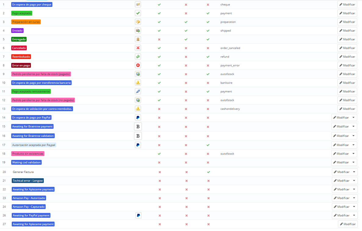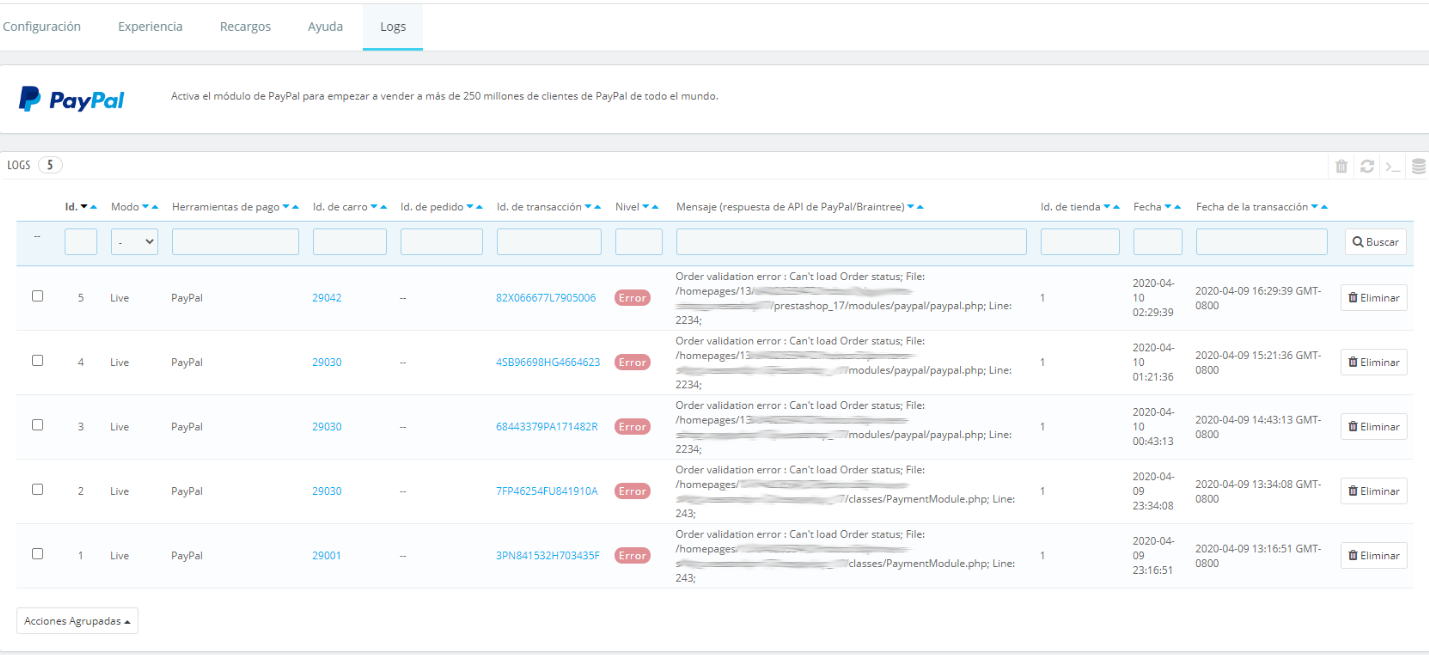 frank1986 Posted April 11, 2020 Share Posted April 11, 2020 (edited) Hola, Tengo un problema, haber si me podéis echar una mano. Tengo mi web en funcionamiento, todo funciona correctamente pero no se que ha pasado que ahora, al hacer un pedido y pagar con Paypal, lleva a la plataforma de pago y al volver, el pedido ha sido cobrado al cliente y en el Backoffice no aparece nada, solo una pagina de error al volver diciendo que se ha cobrado pero se ha producido un error. No recuerdo haber tocado nada, es muy raro y por más que miro no encuentro el error. Adjunto un par de imágenes, una con el log del módulo de Paypal, que dice "Can't load Order status" y otra imagen con los estados actuales que tengo. He revisado los estados y los que vienen por defecto estan todos bien, tanto el ID como nombre, tanto en el BO como en la base de datos... y da igual la versión de paypal que use, todos dan el mismo error. tengo Prestashop 1.7.6.0. Qué puede ocurrir? Edited April 11, 2020 by frank1986 (see edit history) Link to comment Share on other sites More sharing options...