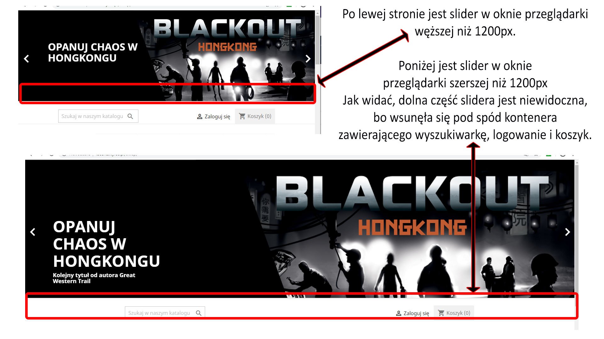 przemko Posted April 15, 2020 Share Posted April 15, 2020 (edited) Cześć, Mam nadzieję, że ktoś będzie mi w stanie szybko pomóc, bo problem chyba nie jest trudny do rozwiązania, a jest irytujący dla osoby nie znającej się mocno na css. Założyłem czystą prestę 1.7.6.3 i theme classic. Przepiąłem standardowy Slider do displayBanner, żeby był w pełnej długości ekranu. Są jednak pewne problemy, bo strona się trochę rozjeżdża. Pomożecie? Problem 1: kiedy strona w przeglądarce jest węższa niż 1200px (a obrazek w slajderze jest nie większy niż 1182px), to nie ma problemu. Przy zmianie rozmiaru dobrze się skaluje i wszysto widać. Natomiast kiedy poszerzam przeglądarkę i obrazek w slajderze poszerza się na 1183px lub powyżej, to obrazek ze slajdera zaczyna chować się pod elementy menu, które są w poniżej (elementy z displayNav). Załączam obrazek przedstawiający "mały ekran" i "poszerzony ekran". Problem 2: u dołu strony pojawił się pasek przewijania, który przewija tak naprawdę tylko kilka pikseli. To też jakiś efekt uboczny po wsadzeniu tego slidera do displayBanner. Pomożecie mi proszę naprawić problem? Co już robiłem: - wyłączyłem cache, żeby mieć zawsze świeży widok, natomiast i tak czyszczę cache z poziomu admina w presta, na wszelki wypadek - zmieniałem w theme.css height dla elementu carousel item z 340px na 440px, ale nie pomogło. Będę wdzięczny za wszelką pomoc. Edited April 15, 2020 by przemko (see edit history) Link to comment Share on other sites More sharing options...