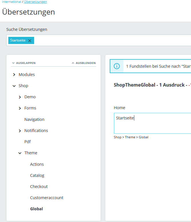 Thomahawk Posted April 17, 2020 Author Share Posted April 17, 2020 (edited) Many thanks, JBW, this worked. Honestly, never in my life I would have found that. So for others with the same problem: - In the backend go to international - translations - in the first block "changing translations" choose part: "template translations" and your template and language, then click on the button to the right below. - then search for the word you want to change A problem though, if it is a word for which several results are found, it only shows one of them and I don't see how to get to the others. But in my case, there is only one result "startseite", I simply but in "Shop" instead, save and it's changed in frontend. Edited April 17, 2020 by Thomahawk (see edit history) Link to comment Share on other sites More sharing options...