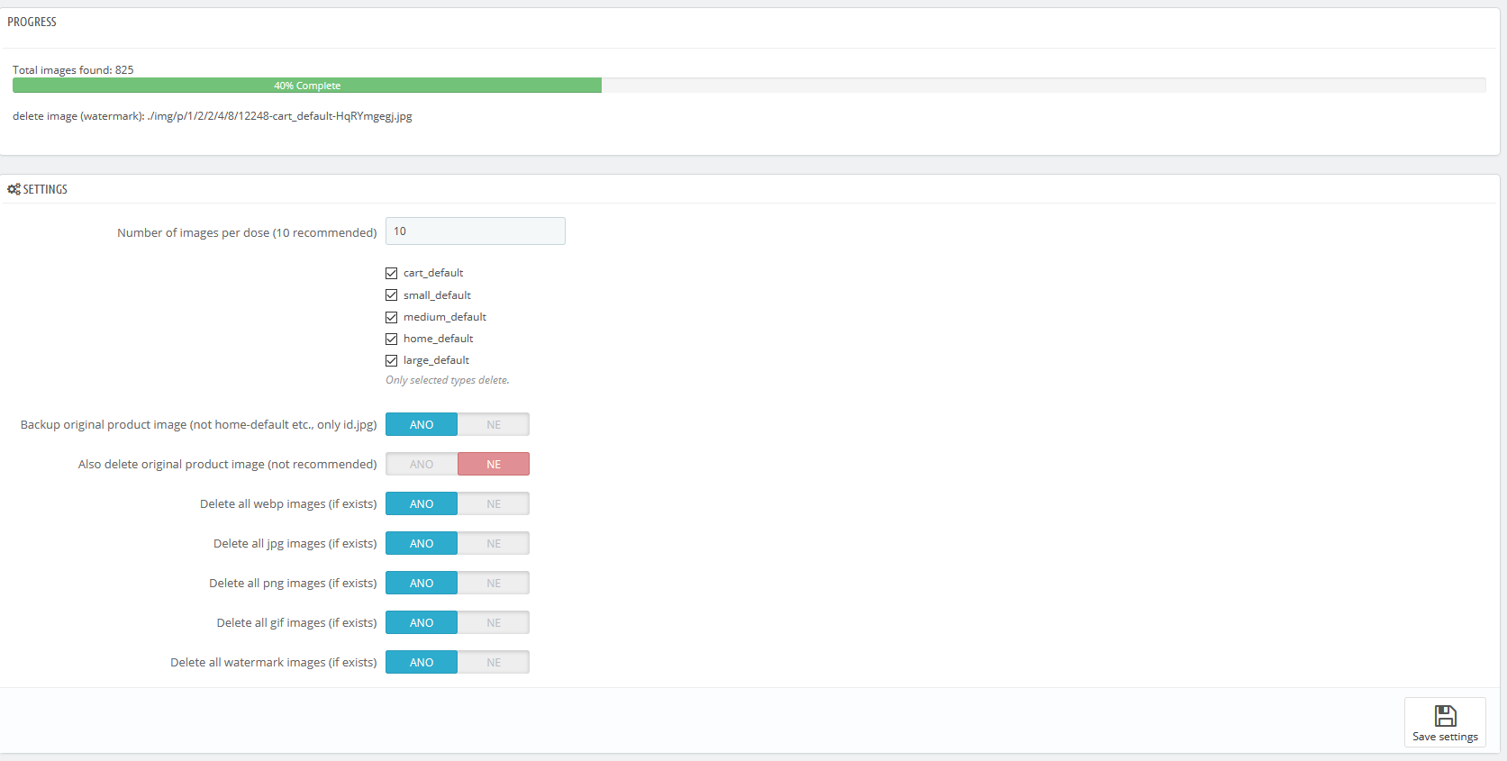 Guest Posted April 17, 2020 Share Posted April 17, 2020 (edited) Here is a script that removes all webp images and all thumbnail images. Does not delete the original image. If the script finishes with an error (time runs out), no matter, you can run it again. Checks if there is an image, if any, deletes it, otherwise it continues. Save the script as eg delete-image.php Save this script to the Prestashop main directory. If you just want to test the script, just 3x comment on unlink. //unlink($imag.... I recommend backing up the ./img/p folder !!! <?php ini_set('display_errors', 1); ini_set('display_startup_errors', 1); error_reporting(E_ALL); include(dirname(__FILE__) . DIRECTORY_SEPARATOR . 'config' . DIRECTORY_SEPARATOR . 'config.inc.php'); include(dirname(__FILE__) . DIRECTORY_SEPARATOR . 'config' . DIRECTORY_SEPARATOR . 'settings.inc.php'); $images_path = ''; $get_images = Db::getInstance()->ExecuteS('SELECT * FROM '._DB_PREFIX_.'image ORDER BY id_product ASC;'); $get_images_type = Db::getInstance()->ExecuteS('SELECT * FROM '._DB_PREFIX_.'image_type ORDER BY id_image_type ASC;'); foreach ($get_images as $get_image) { $image = new Image($get_image['id_image']); $image_webp_url = _PS_ROOT_DIR_.'/img/p/'.$image->getExistingImgPath().".webp"; $images_path .= $image_webp_url."\r\n"; if (file_exists($images_path)) { unlink($images_path); echo 'deleted image: '.$images_path.'<br />'; } foreach ($get_images_type as $get_image_type) { $image_jpg_url = _PS_ROOT_DIR_.'/img/p/'.$image->getExistingImgPath().'-'.$get_image_type['name'].".jpg"; if (file_exists($image_jpg_url)) { unlink($image_jpg_url); echo 'deleted image: '.$image_jpg_url.'<br />'; } $image_webp_url = _PS_ROOT_DIR_.'/img/p/'.$image->getExistingImgPath().'-'.$get_image_type['name'].".webp"; if (file_exists($image_webp_url)) { unlink($image_webp_url); echo 'deleted image: '.$image_webp_url.'<br />'; } } } echo 'Done'; Then just write a script that regenerates the images. But I will not write here anymore. It's laborious. Edited April 17, 2020 by Guest (see edit history) Link to comment Share on other sites More sharing options...