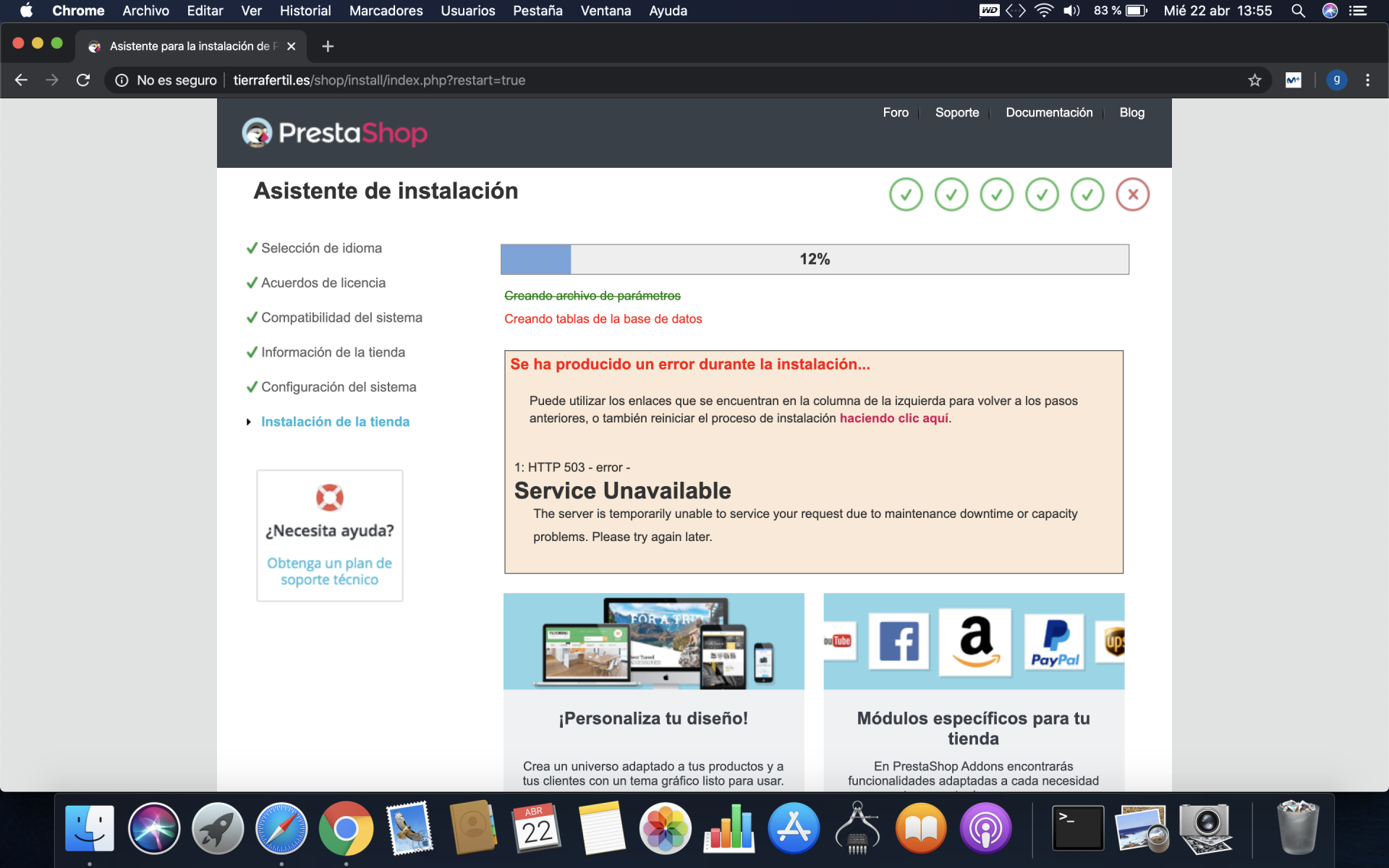 gutobisio Posted April 23, 2020 Author Share Posted April 23, 2020 hace 18 horas, juanrojas dijo: cambia a php 7.2 y dinos el noombre de tu servidor Gracias juanrojas. he cambiado el php a 7.2.29 y he instalado prestashop en una nueva carpeta con nueva SQL pero se sigue bloqueando en el 12% del proceso con el mismo error. Link to comment Share on other sites More sharing options...