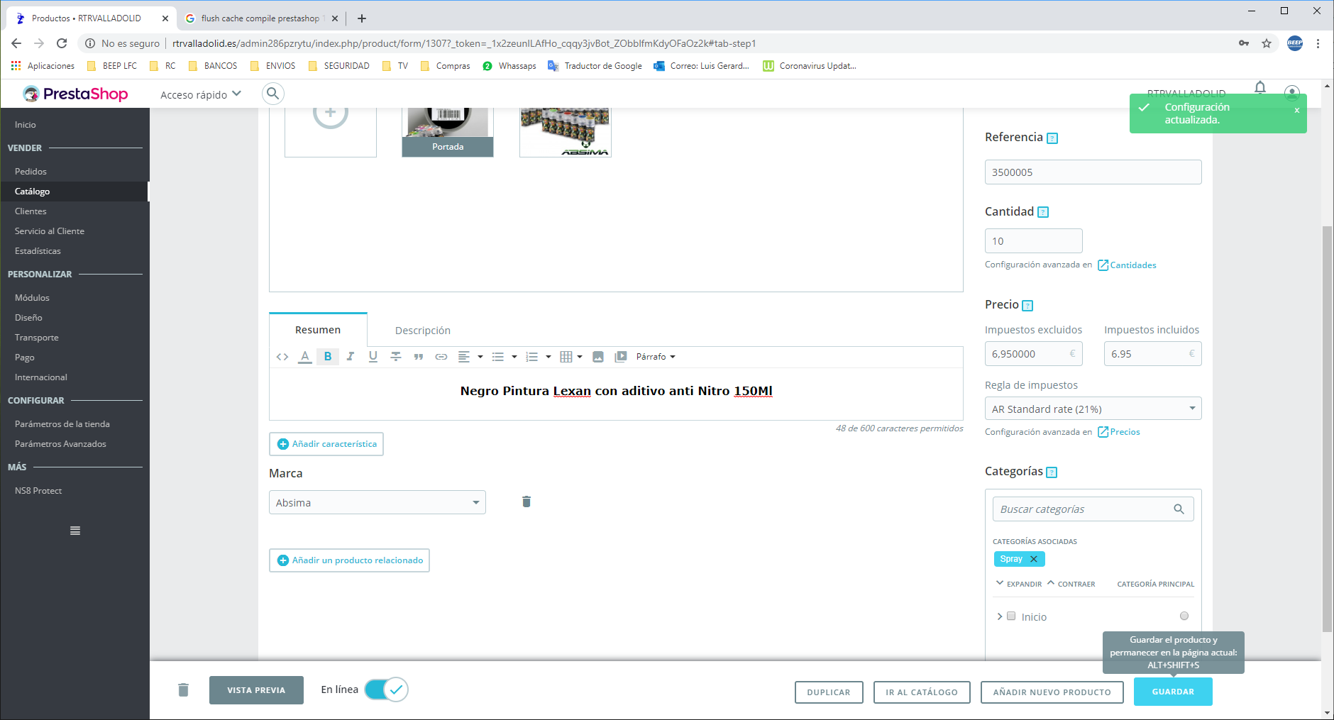 rtrvalladolid Posted April 22, 2020 Share Posted April 22, 2020 (edited) EL problema me ha surgido a mover las subcategorias dentro de otras categorías para acortar el menú les muestro gráficamente lo que me sucede si quiero modificar este articulo subir cantidad de 5 a 10 por ejemplo subo a 10 y después guardo despues de subir a 10 no sube me voy al producto en la lista de producto y sigue con 5 Edited April 22, 2020 by rtrvalladolid (see edit history) Link to comment Share on other sites More sharing options...