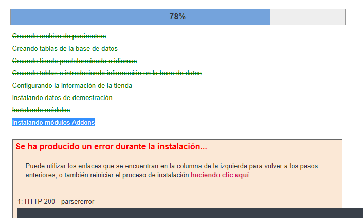 nata_cadiz Posted May 1, 2020 Share Posted May 1, 2020 (edited) Hola amig @ s !, después de un tiempo, me vuelvo a poner en marcha con una web que tenía aparcada. Al intentar hacer uso de una plantilla que comprime hace tiempo para la versión 1.6 de Prestashop, me topo con el problema de que, no soy capaz de terminar la instalación de Prestashop en la versión 2.2 de Wamp. Al principio me arrojaba error de PhpMyAdmin (no tiene permisos para acceder a estos controles) luego, idiomas faltantes (español y catalán) y ahora por último, después de solucionar los anteriores, en el último paso, Complementos de módulos de instalación, me da error y no me aparece ningún código que identifique el error. Alguien sabría decirme qué sucede ?? Gracias !! PD: El mensaje que me aparece es como el que adjunto, pero sin el código de error que aparece y ha probado la última versión de wamp, se instala pero no me puedo acceder al backoffice. Edited May 2, 2020 by nata_cadiz (see edit history) Link to comment Share on other sites More sharing options...