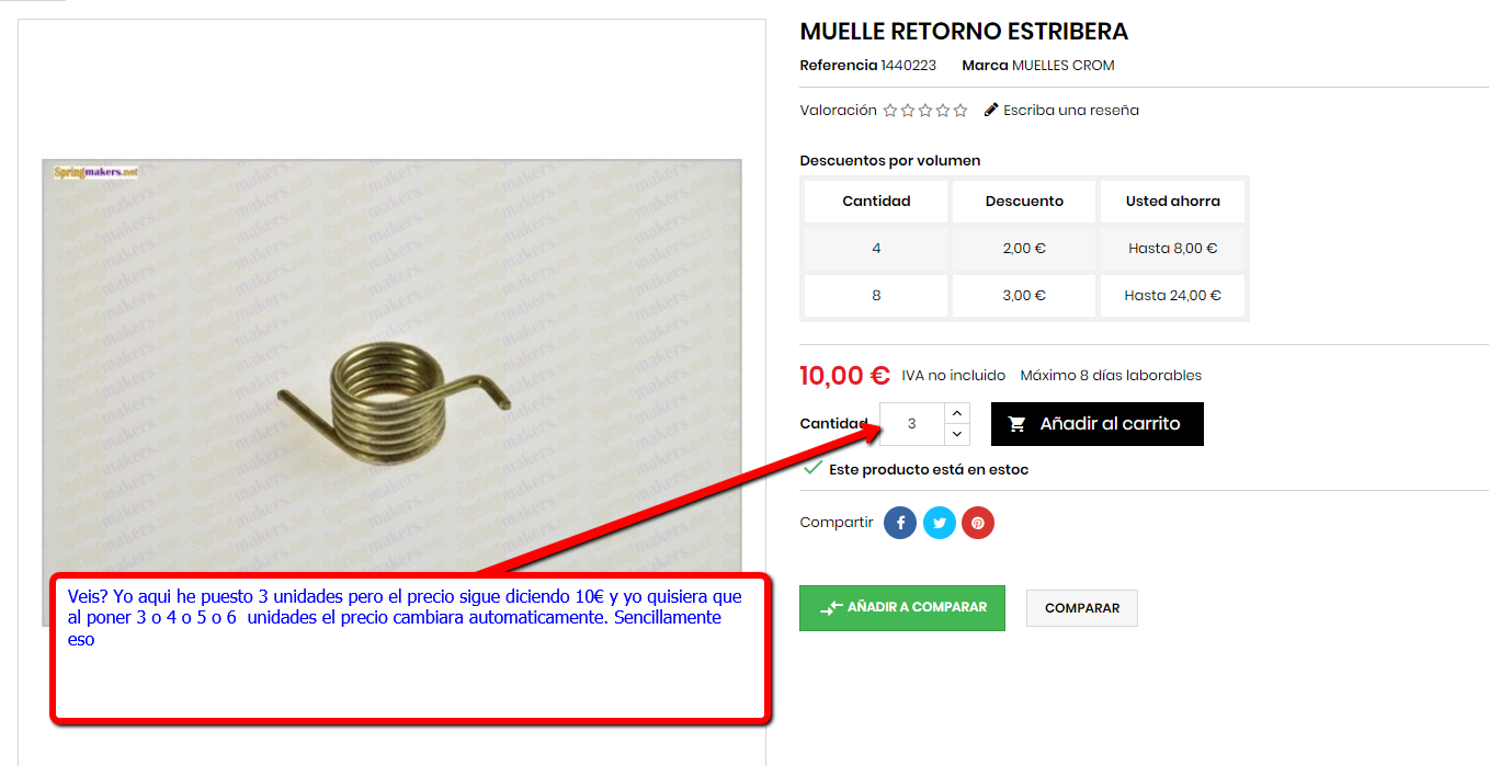 LUCAFO Posted May 1, 2020 Share Posted May 1, 2020 (edited) Prestashop es una gran aplicación de la cual pocas quejas tengo y es muy potente Pero tiene una laguna brutal A la hora de aplicar descuentos por cantidad es una chapuza de mayúsculo tamaño Lo suyo seria que al ir incrementando cantidad o decrementando la cantidad el precio variase automáticamente en lugar de poner una tabla infame que aparte no entiende nadie Alguien me puede guiar por favor? Existe algo que sea un poco digno? mi web es www.springmakers.net Muchas gracias Edited May 1, 2020 by LUCAFO link forgotten (see edit history) Link to comment Share on other sites More sharing options...