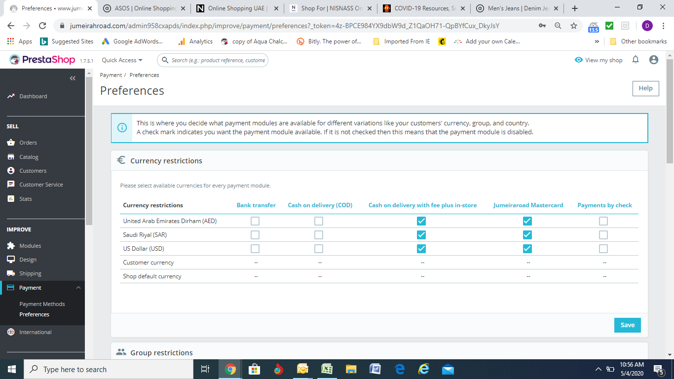 deepikaraj Posted May 3, 2020 Share Posted May 3, 2020 Hello I have my webstore on prestashop 1.7.5.1using the Warehouse Theme. I am facing issues on the multiple currencies feature. I display 3 different currencies(AED, SAR and USD) available to a customer to view the product pricing in their choice of currency and the default currency (AED) has also been set. But when a customer checks out in a non default currency say USD / SAR the payment options i.e. Payment by credit card (our payment gateway) or the COD options dont show. A customer has to change the currency back to AED to conclude the transactions. Appreciate if anyone can help on this. Thank you. Link to comment Share on other sites More sharing options...