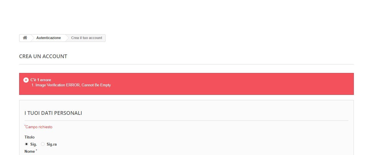 MG MMS Posted May 4, 2020 Share Posted May 4, 2020 (edited) Buonasera PrestaShop 1.6.1.4 In fase di registrazione, compilando tutti i campi correttamente e cliccando su "registra" viene visualizzato il seguente errore: C'è 1 errore Image Verification ERROR, Cannot Be Empty Come è possibile risolvere questo problema? Grazie Grazie Edited May 4, 2020 by MG MMS (see edit history) Link to comment Share on other sites More sharing options...