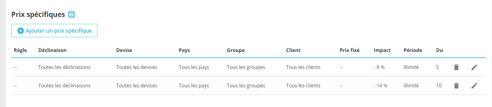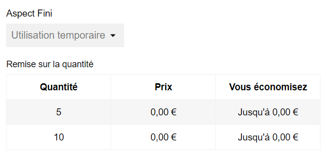 Gabardin Posted May 5, 2020 Share Posted May 5, 2020 (edited) Bonjour, Je suis actuellement sous la version PrestaShop 1.7.5.1, et je rencontre un problème sur le site concernant les prix spécifiques. J'ai un produit avec deux déclinaisons, avec un montant différent entre ces 2 déclinaisons ( X et Y). Je veux appliquer un prix spécifique pour 2 tranches, sur ces 2 déclinaisons, ce qui fait : X ou Y- 5 pièces on applique moins 8% X ou Y - 10 pièces on applique moins 14% Sur le site, les prix spécifiques pour la déclinaison X ou Y est à 0 €. Par contre lorsqu'on à pas un article avec déclinaison les prix spécifiques fonctionnent à merveille. Merci de votre aide d'avance. Cordialement, Gabardin Edited May 5, 2020 by Gabardin (see edit history) Link to comment Share on other sites More sharing options...