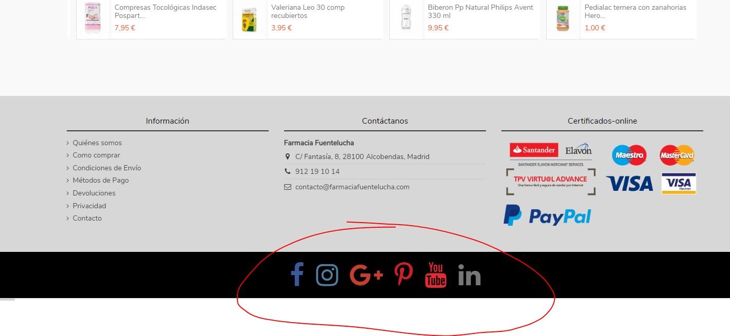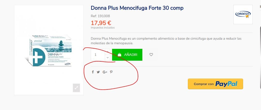 Pack_12 Posted May 7, 2020 Share Posted May 7, 2020 (edited) Muy buenas, a ver si alguien sabe como ayudarme con esto: Partimos de que esta es mi home (1.7.5.2 + Plantilla warehouse ) --> adjunto rrss1.jpg y rrss_footer.jpg Además, en las fichas de producto hay unos iconos pequeños de rrss --> ajunto fichaprod_rrss.jpg Pues bien, se trata de lo siguiente. Estoy abriendo en mi web de farmacia la posibilidad de vender medicamentos online (no sujetos a prescripción médica). llevo más de un año de trámites y por fin me dicen lo ultimo que me falta. Y de todo ello me tiene descalabrado solo estas cosas que tienen que ver con RRSS: 1- Me dicen que en la página de MEDICAMENTOS (categoría principal de MEDICAMENTOS) no puede haber enlaces a redes sociales como en el resto de páginas de productos de parafarmacia. ¿Alguien sabe como puedo deshabilitar los iconos de RRSS tanto de la cabecera como del footer? No quisiera tener que quitarlos en toda la web solo por esto. Solo deberían desaparecer en las páginas que estén dentro de la categoría de MEDICAMENTOS 2- Por otro lado, ningún medicamento puede tener iconos de RRSS y botos de añadir a lista de deseos como las demás fichas de producto. ¿Como podría quitar esos iconos en funcion de su categoria? ¿O tal vez hacerlo producto a producto? 3- Y por último, eliminar tambíen la pestaña de reseñas, ya que los medicmantos tampoco debería tener. GRACIAS de antemano! Espero que alguien se le ocurra algo, llevo tanto tiempo detrás de esto.. ¿Tendría alguna otra opción más radical? No se, tal vez crear otro dominio? El tema es que el carrito debe ser común. Lo unico que conseguí de todo esto es no aplicar los cupones de descuento a los productos que están dentro de categoría de medicamentos, esto también me lo pidieron y si que lo conseguí modificando el ámbito de los descuentos. Slds, Edited May 29, 2020 by Pack_12 (see edit history) Link to comment Share on other sites More sharing options...