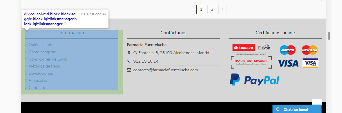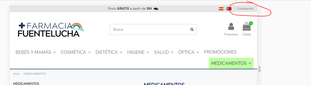Pack_12 Posted May 29, 2020 Author Share Posted May 29, 2020 On 5/8/2020 at 8:55 PM, ventura said: Para los productos puedes utilizar estas clases PRODUCTOS product-id-2 // ID del producto product-nombre-producto // Nombre del producto product-id-category-5 // Productos categoria por defecto product-id-manufacturer-1 // Producto por fabricante product-id-supplier-0 // Producto por proveedor product-available-for-order // Productos disponibles para la venta CATEGORIAS category-id-5 // Categoria por ID category-women // Categoria por nombre category-id-parent-3 // Nivel dentro de la categoria padre category-depth-level-3 // Nivel de la categoria dentro del arbol Muy buenas, Reabro este hilo porque tengo que ocultar alguna cosa más según me indican. Pero en este caso se trata de ocultar dos cosas. Una del header y otra del footer. https://www.farmaciafuentelucha.com/es/medicamentos-9 Necesito que la categoría de Medicamentos (cat. 9) se oculte el apartadodel header que indico en la imagen. La clase es rte-content d-inline-block. Sin embargo, el mismo código que he utilizado para ocultar cosas de RRSS en contenido de la página en este caso no funciona. Y en el footer, todo el bloque de links a otras páginas. La clase por lo que vi es col col-md block block-toggle block-iqitlinksmanager block-iqitlinksmanager-1 block-links js-block-toggle ¿Como conseguiría ocultarlos solo en esa categoría? Muchas gracias de antemano, imagino que tengo que cambiar código en algún fichero distinto. Slds, Link to comment Share on other sites More sharing options...
