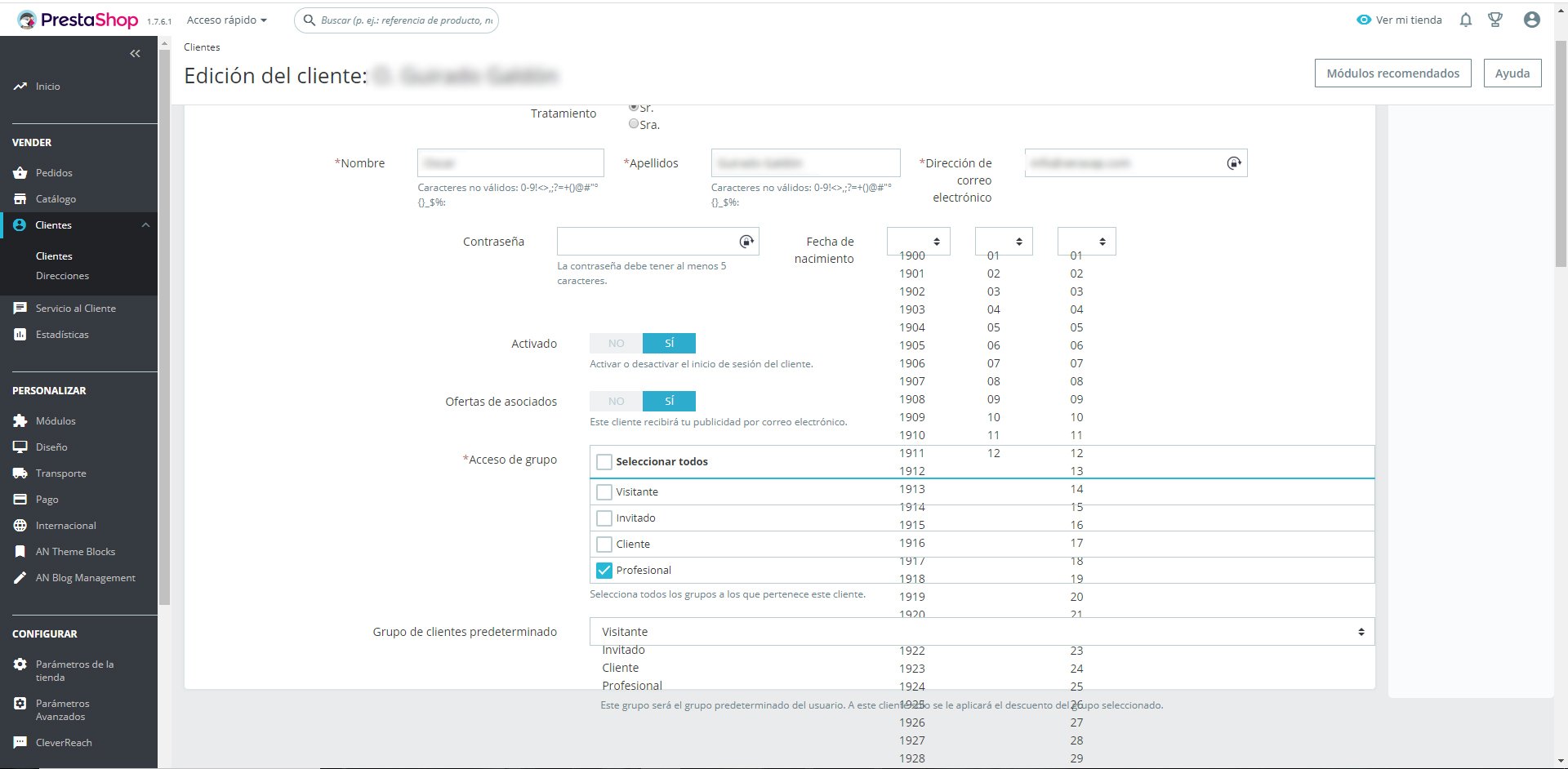 Os envío una captura de pantalla de un cliente al que quiero modificar para ponerlo en el grupo profesional y no deja cambiarlo.