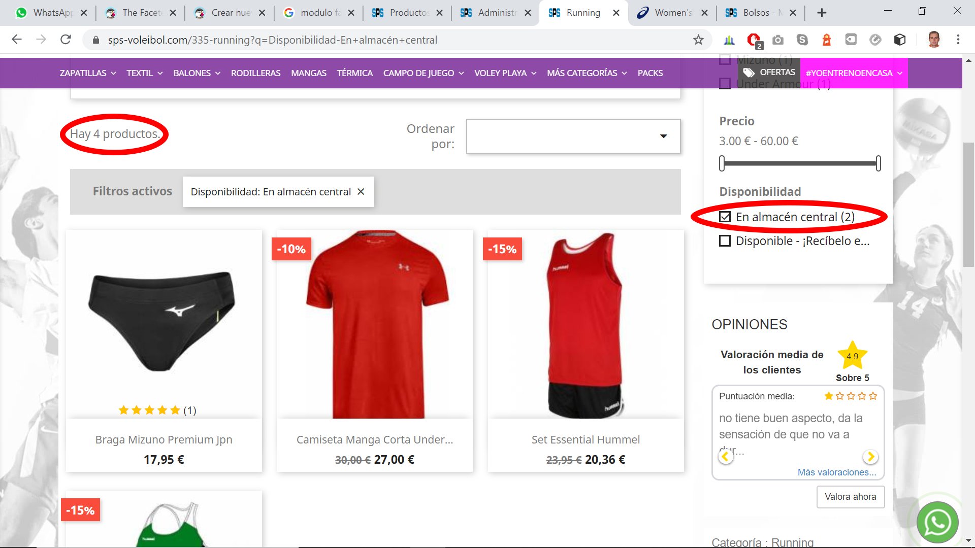 franky.martin Posted May 12, 2020 Share Posted May 12, 2020 Hola, he activado en el módulo de búsqueda por facetas el filtro de stock pero observo que no funciona de forma correcta porque el resultado no tiene nada que ver con la realidad. También ocurre con el filtro por atributo Tallas. Ya he reconstruido el índice de precios y atributos varias veces para ver si se solucionaba pero nada. En las imágenes podéis ver que en el filtro de disponibilidad indica 2 productos "En almacén central" (SIN STOCK) pero en el resultado de búsqueda aparecen 4 productos. Al entrar en uno de estos 4 productos se observq que SÍ tiene stock. ¿Alguién sabe cuál es lógica que sigue este módulo para mostrar sus resultados? Uso Prestashop 1.7.4.4 y la versión del módulo v3.1.0. Podría probar a actualizar a la última versión pero ya lo hice hace unos meses y dejo de funcionar por completo el módulo. Un saludo Link to comment Share on other sites More sharing options...