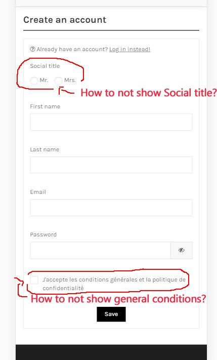 Philippe2333 Posted May 13, 2020 Share Posted May 13, 2020 Hello, I have Prestashop 1.7.6.4 and use WAREHOUSE Theme. When a user tries to CREATE an account : 1) How to not show the Social Titles ? 2) How to not show the general conditions ? Thanks Link to comment Share on other sites More sharing options...