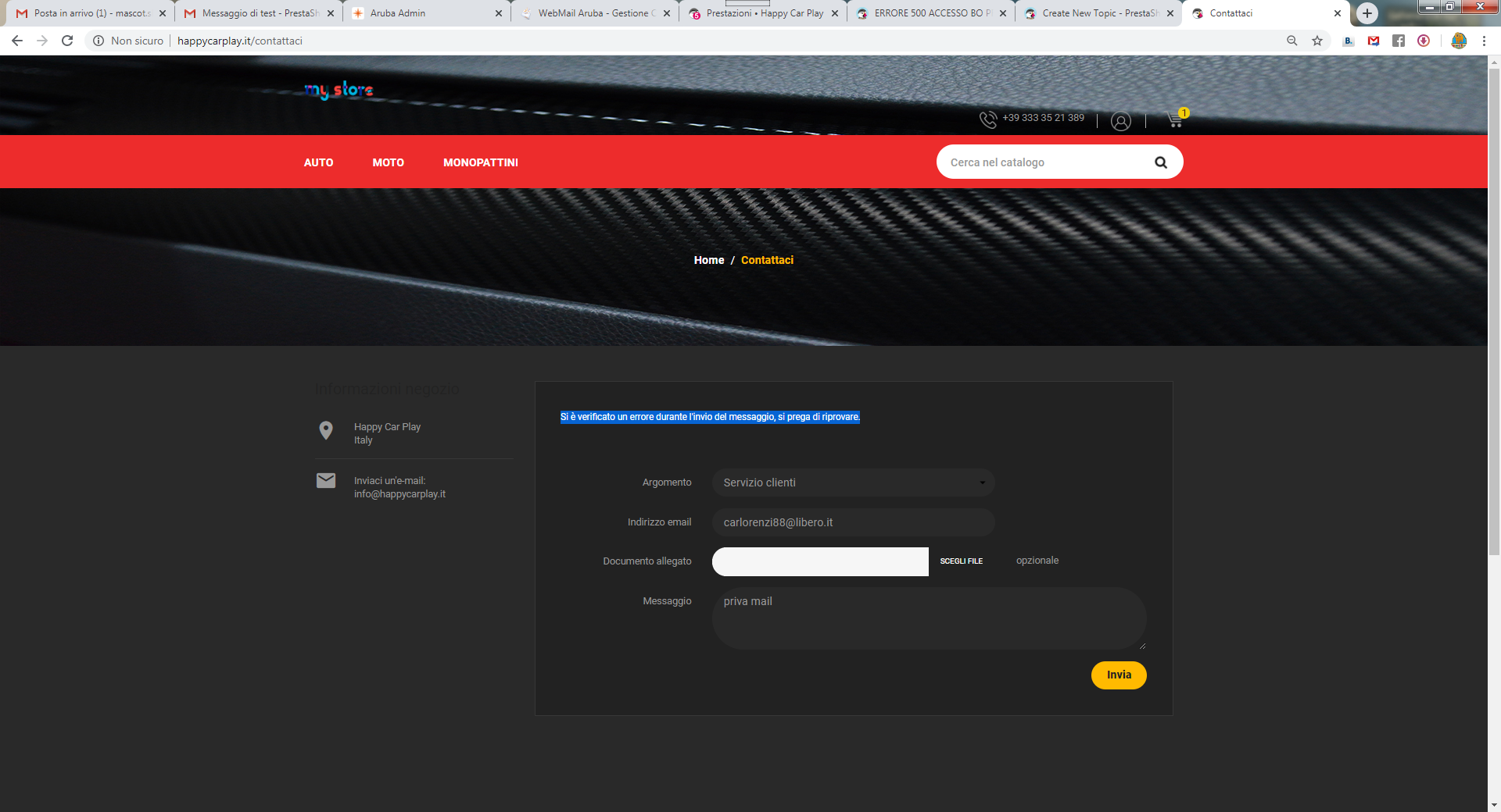 Carlo Tan Posted May 13, 2020 Share Posted May 13, 2020 Buongiorno, ho questo problema da forum contatti del sito non è possibile inviare una richiesta informazioni. appena si inseriscono i dati e si da invia risponde: Si è verificato un errore durante l'invio del messaggio, si prega di riprovare. ho versione 1.7.6.5 su aruba con PHP7.0.x alle file della mia configurazione Grazie Link to comment Share on other sites More sharing options...