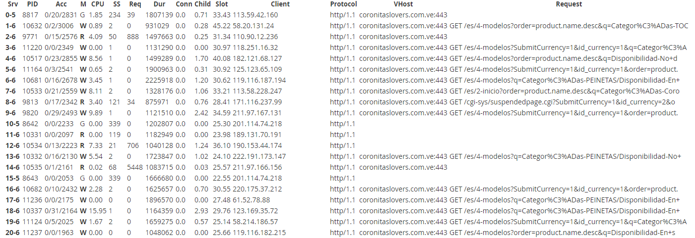 WildRacer Posted May 14, 2020 Share Posted May 14, 2020 Buenas noches, tengo una tienda con la versión 1.7, tiene meses funcionando sin problemas. De pronto comenzó un consumo exageradode CPU que tumba el servicio apache del servidor y deja inoperativo el VPS que hace de hosting. Suspendi la pagina por el WHM y en los logs siguen solicitudes buscando la pag. ¿Que solución se le puede dar a esto? adjunto el grafico que da el servicio de VPS del consumo de CPU, baja al momento de suspender la pagina. Este es el grafico del apache que da el WHM (la lista era mucho mas larga pero solo coloco el inicio como muestra) gracias por su atención Link to comment Share on other sites More sharing options...