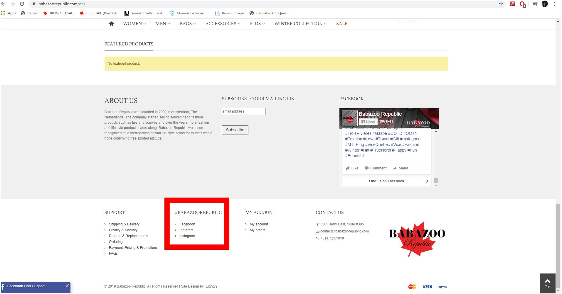 RobinRuthCanada Posted May 16, 2020 Share Posted May 16, 2020 Hi, We changed our social media handles, and we had link to our social media pages at the bottom of our pages I'd like to change the link to the appropriate pages/handles. Right now when you click Facebook/Instagram/Pinterest it sends it to the old link. Attached is a photo of the section I'm trying to change, the link to my website is www.babazoorepublic.com Thank you! Link to comment Share on other sites More sharing options...